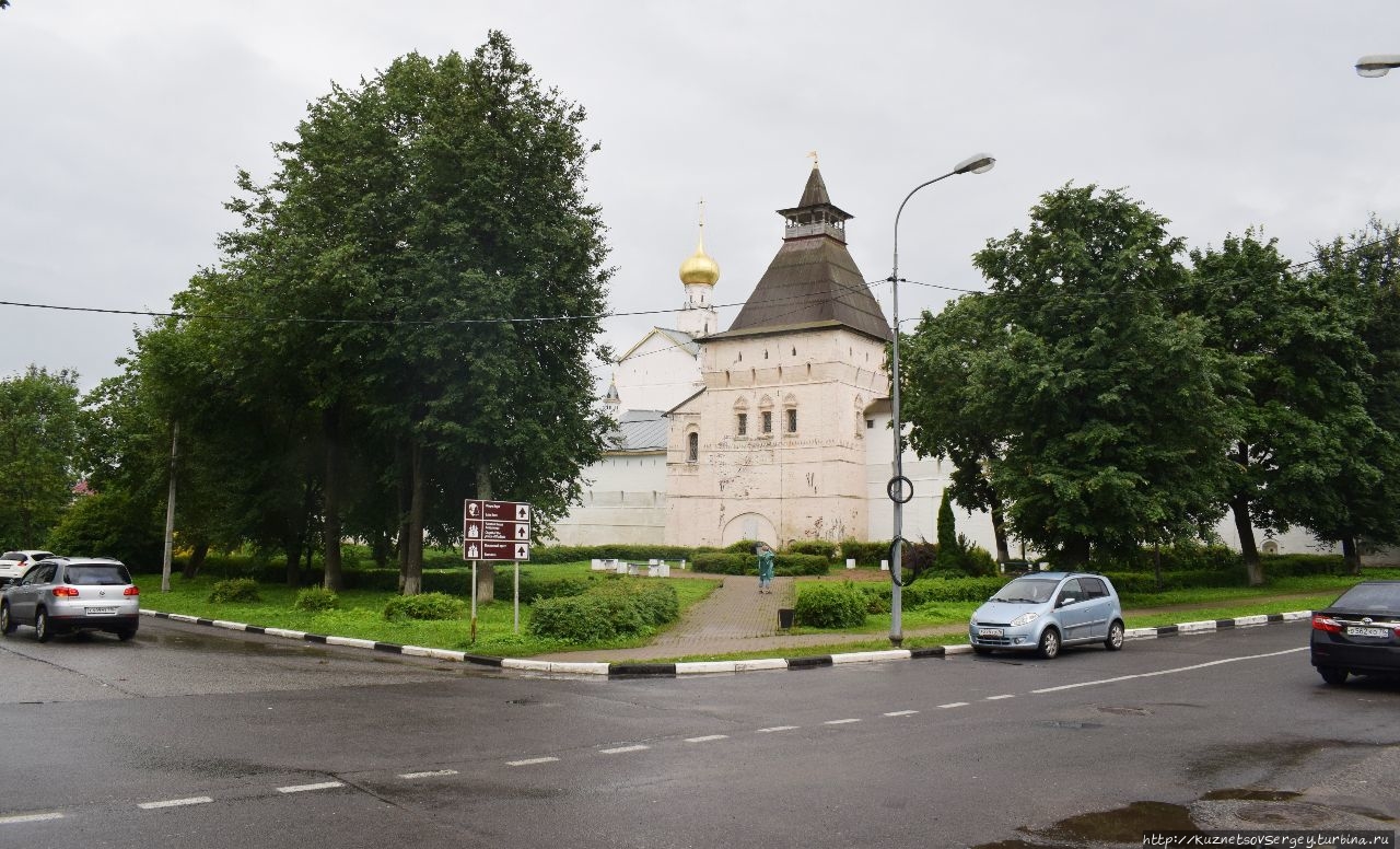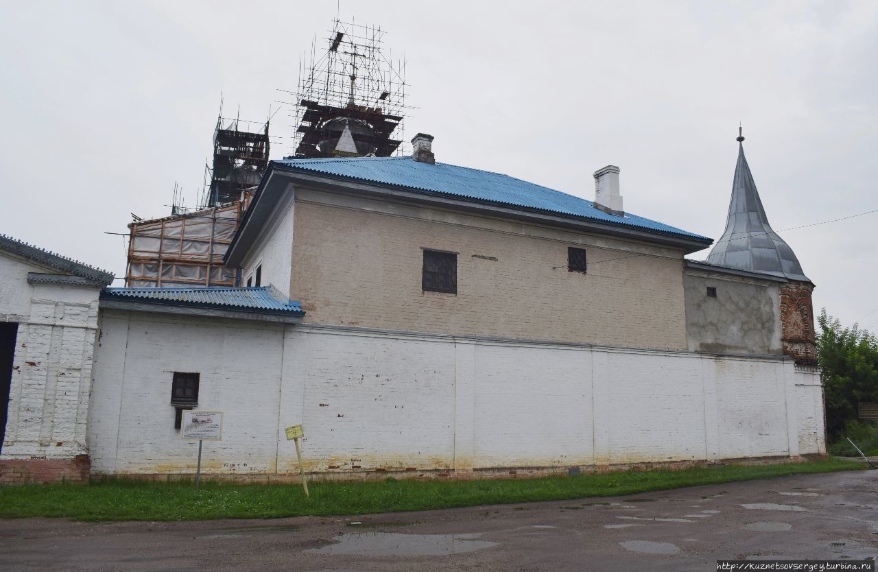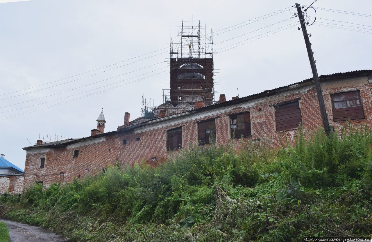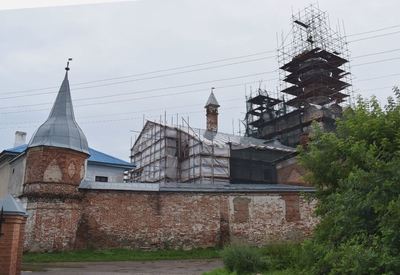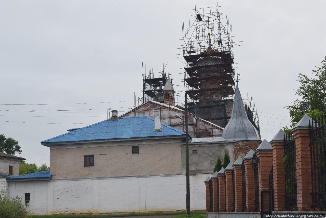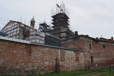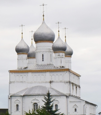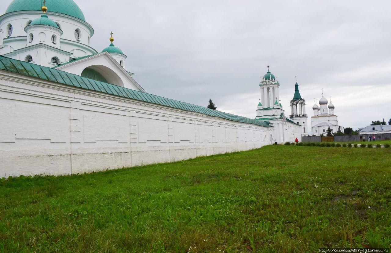 Монастырь был основан в XIV-ом веке. Каменный собор был построен в конце XVII-го века. Находится севернее Ростовского кремля. Сейчас там идет серьёзная реконструкция, для туристов прохода нет. Но и со стороны кирпичные стены монастыря и собор в лесах производят впечатление.