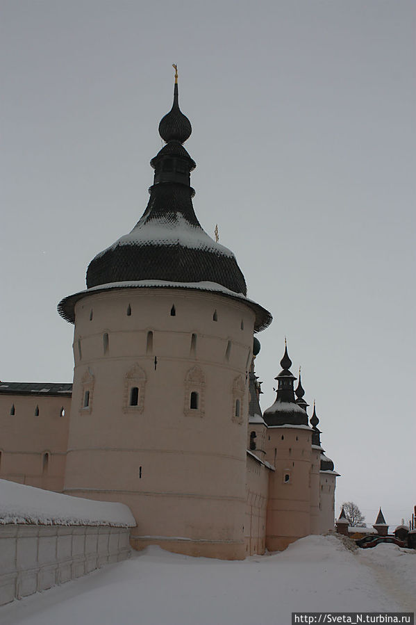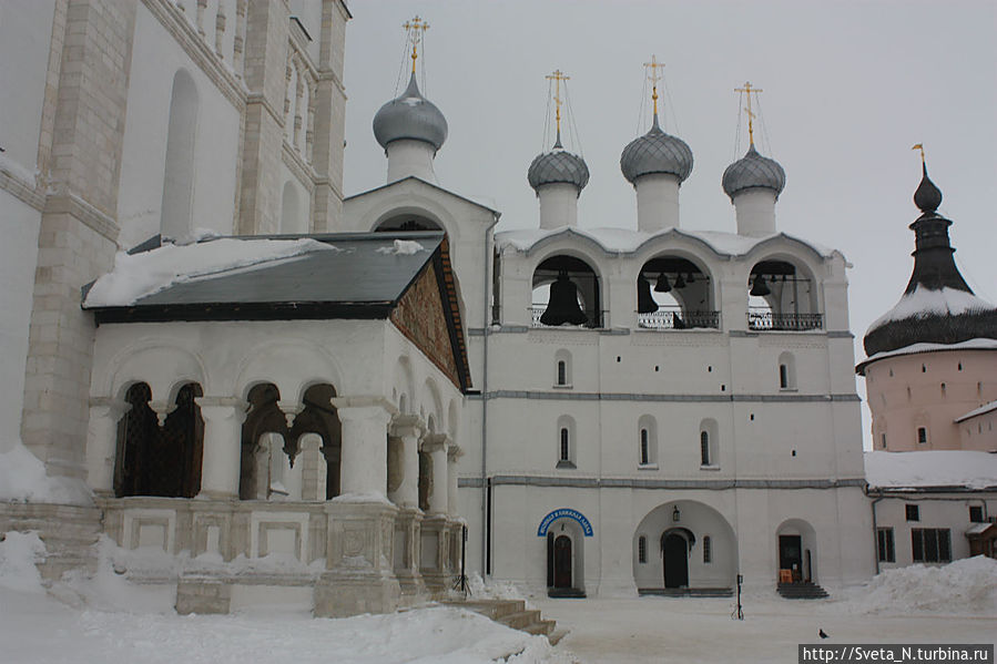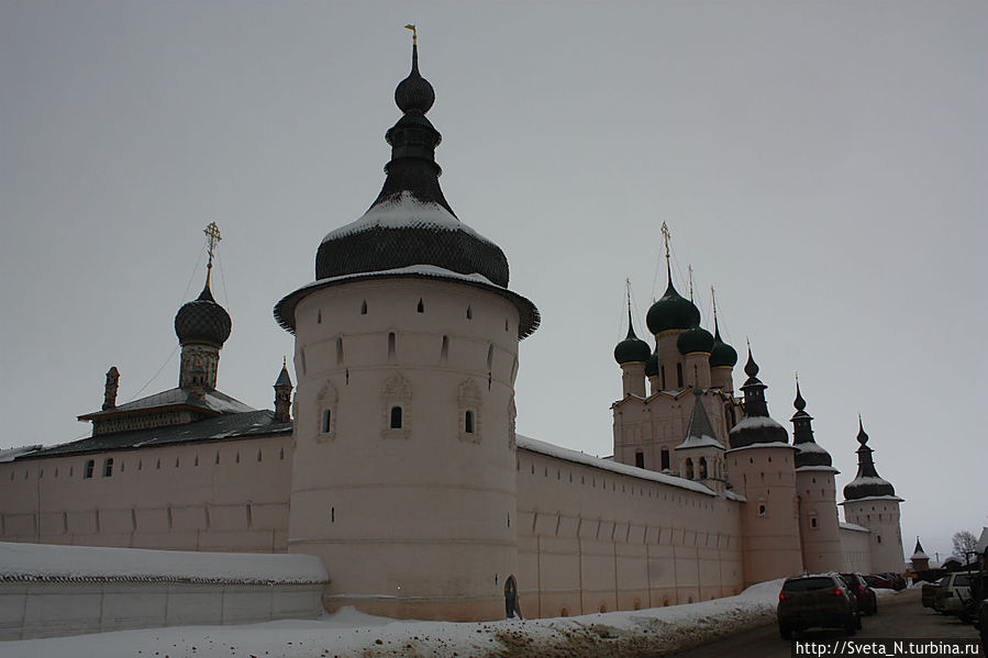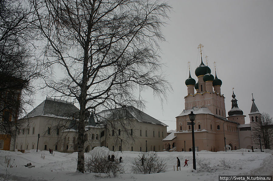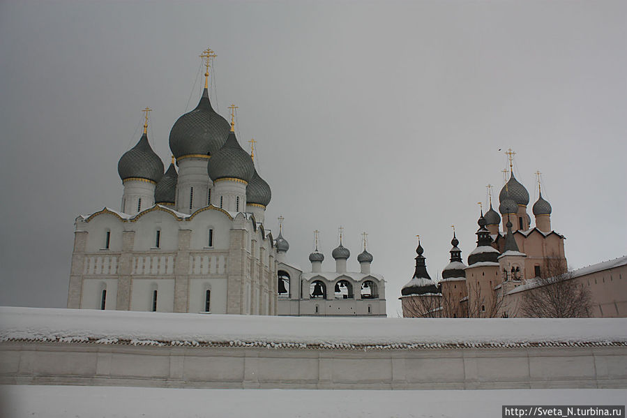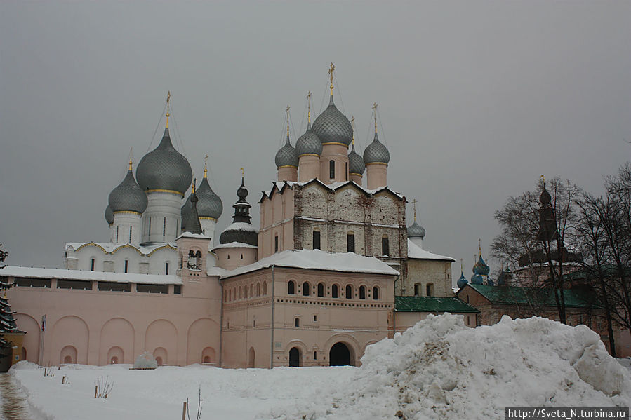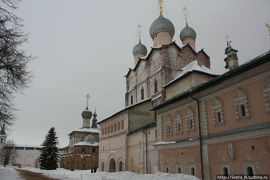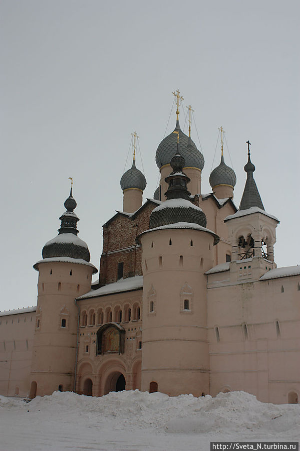 Спустя три года мы снова в Ростове, правда не летнем, а зимнем. Когда я вышла из машины, я обалдела. Какой же красивый кремль! Наконец нет никаких строительных лесов, белоснежные стены соборов перекликаются со снежным покровом, а мягкий розовый оттенок стен и башен прекрасно выделяется на пасмурном небе.