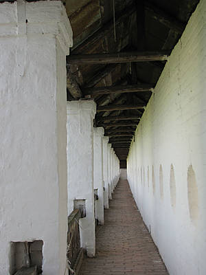 Сквозь бойницу в стене монастыря вид на Хозяйственный двор (бывшая территория Спасо-Песоцкого монастыря).