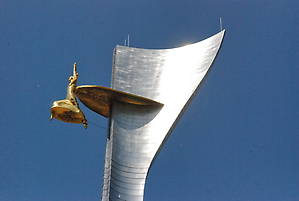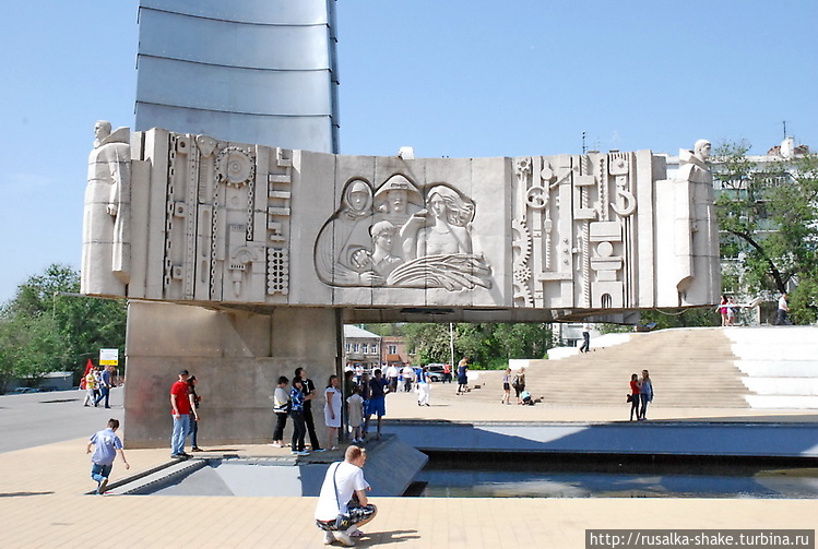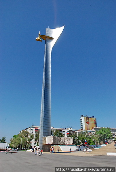 На 72-х метровую высоту взметнулась спаренная стела, увенчанная 100-тонным навершием в виде носа корабля. Со стороны Дона стелу украшает скульптура крылатой богини Ники,
