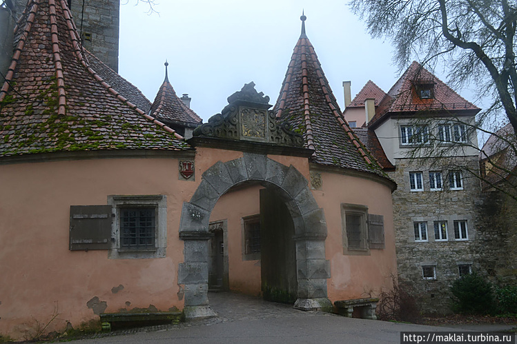 Внешние ворота украшены гербами графов Ротенбургских и Комбургских. На строении ворот и сейчас можно увидеть отверстия для цепей подъемного моста и рельефную маску, через рот которой на нападающих выливали горячую смолу.