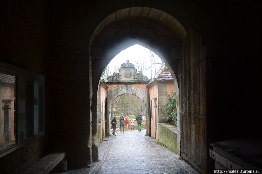 Внешние ворота украшены гербами графов Ротенбургских и Комбургских. На строении ворот и сейчас можно увидеть отверстия для цепей подъемного моста и рельефную маску, через рот которой на нападающих выливали горячую смолу.