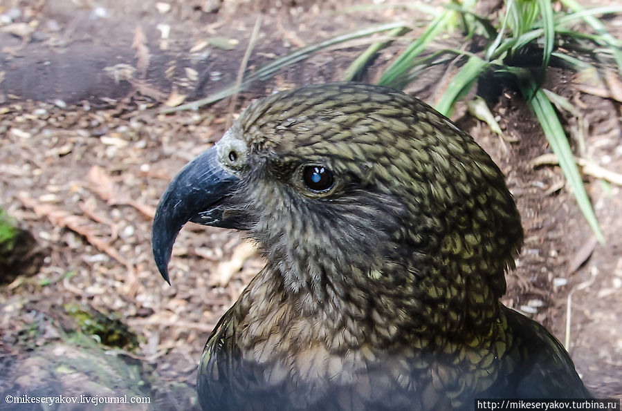 А вот и сам этот "мирный попугайчик", здесь он в клетке, но позднее путешествуя по Южному острову около Милфорд Саунда я увидел его вживую. Считается, что это самая «умная» птица в мире, её интеллект равен интеллекту 6-месячного ребенка, она даже может продумывать двух-трех ходовые комбинации. Сейчас эти горные попугаи – гроза новозеландских ягнят.