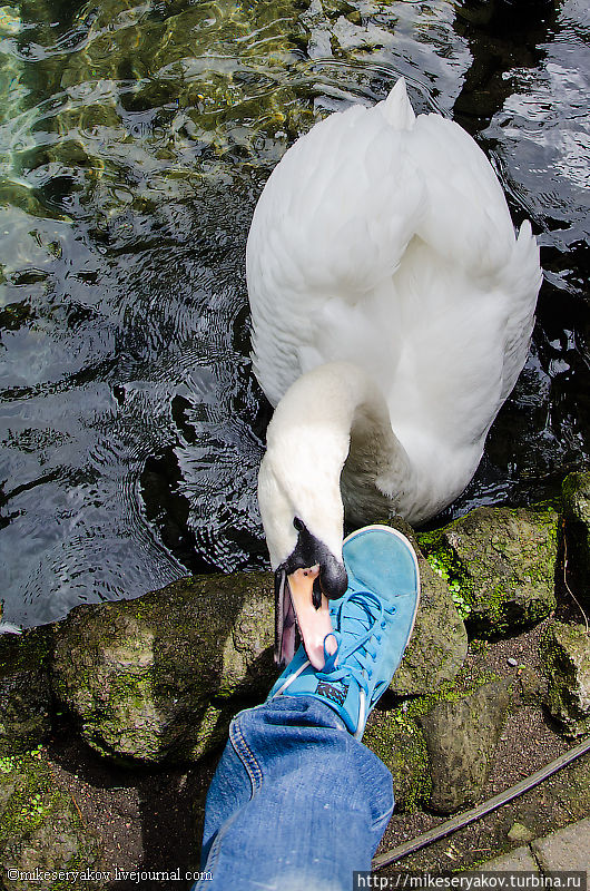 В парке встретился и вот такой агрессивный лебедь, это птица вообще отнюдь не мирная, как только кто-то приближался к его прудику, он начинал активно кусать за кеды, я бы не рекомендовал пробовать подобное в открытых шлепках, укусить "пташка" может достаточно больно.