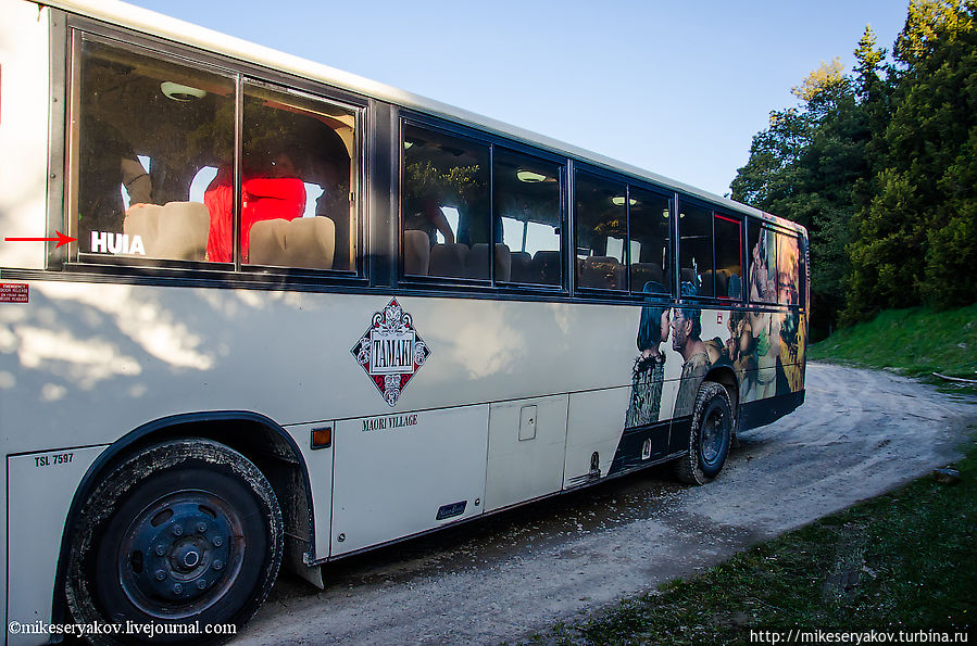 Шоу проходило в деревне Тамаки, в которую везли на автобусах. На автобусе, на котором ехал я мне понравилось слово «Huia” на стекле автобуса, на маорийском наречие оно означает – «собрание» или «ассамблея».