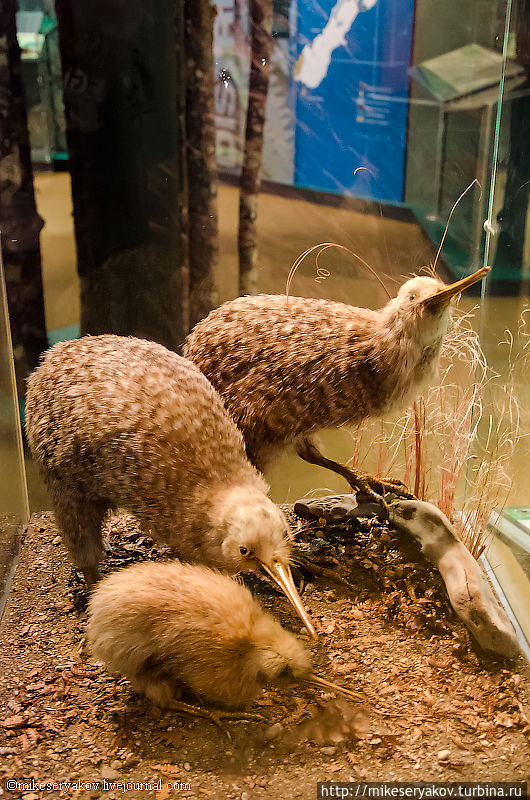 В заповеднике фотографировать живых киви запрещено, а экскурсии проводят по залу, где птица представлена в макетах и в рисунках.