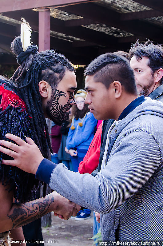 Вход в деревню Тамаки, где маорийский вождь приветствует гостей. Маори всегда при встрече в качестве приветствия трутся носами.