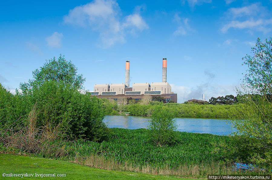 По дороге в Роторуа нельзя было не остановиться и не сфотографировать последнюю действующую теплоэлектростанцию в стране. Она работает на угле.