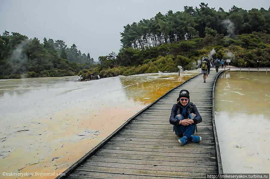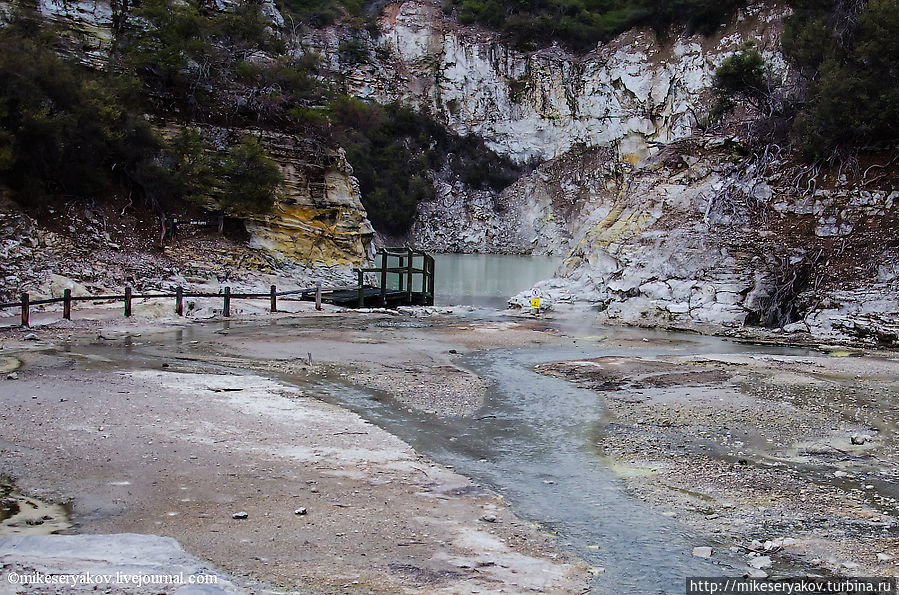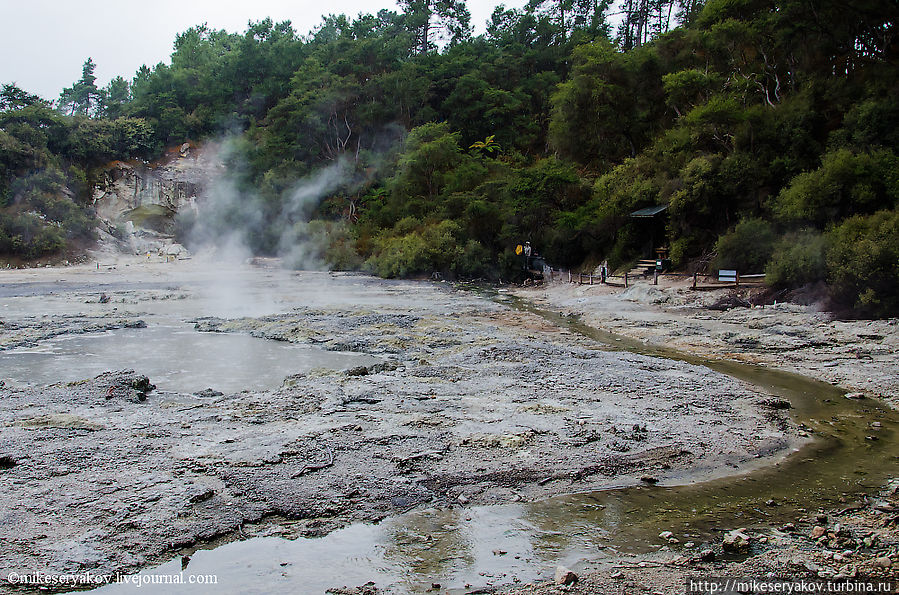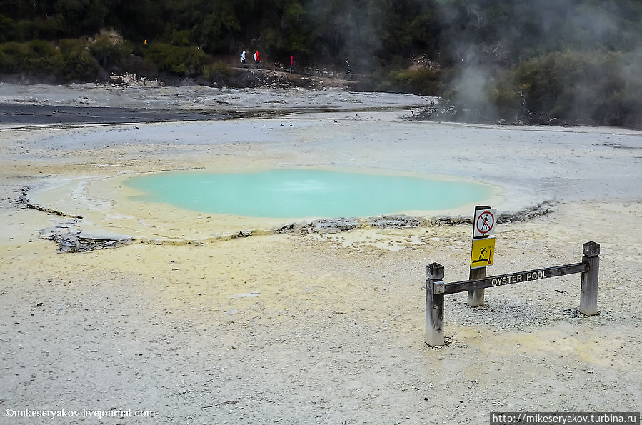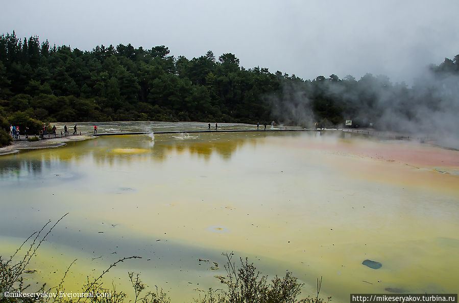 Самая главная достопримечательность комплекса Вай-о-Тапу – огромный бассейн — «палитра художника» — или «озеро шампанского». Уникальны краски это озера, особенно хорошо это видно в солнечную погоду, но во время моего посещения все время лил дождь и стояла дымка тумана, но тем не менее, красоту "палитры" хотя бы отдаленно можно представить.