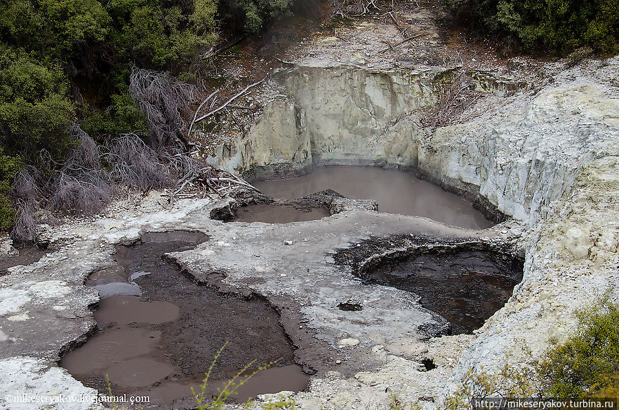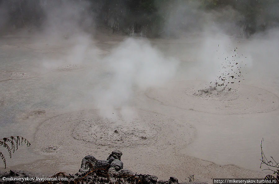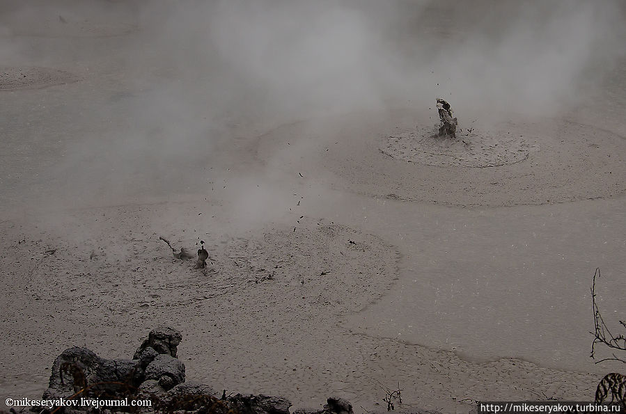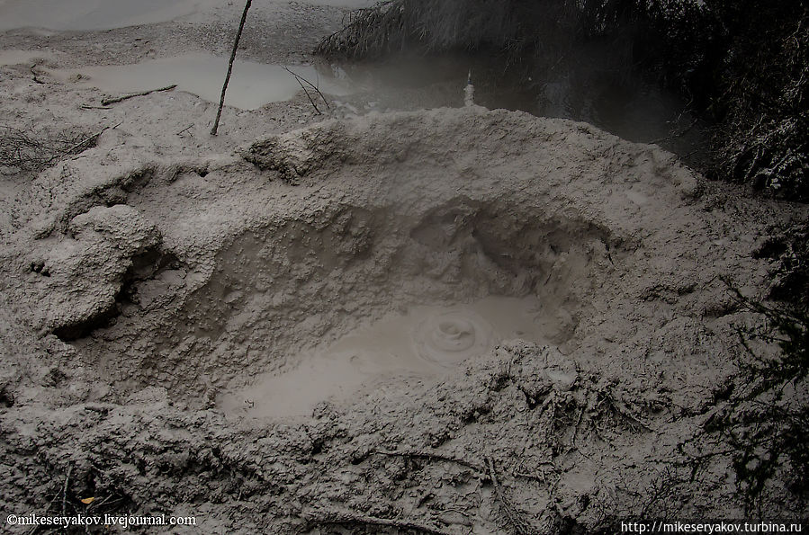 Последним пунктом для посещения я бы рекомендовал посещение грязевого бассейна (mud pool), он находится на некотором удалении от гейзера, в 5-и минутной доступности на автомобиле. Тут можно увидеть, постоянно фонтанирующую грязь.