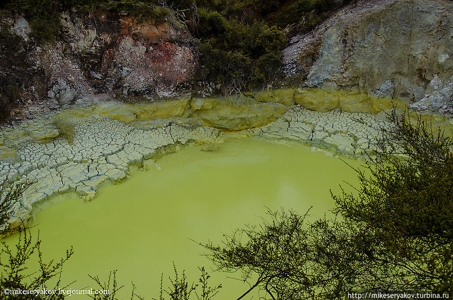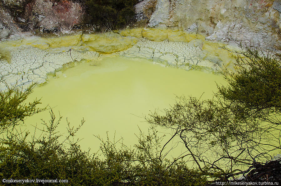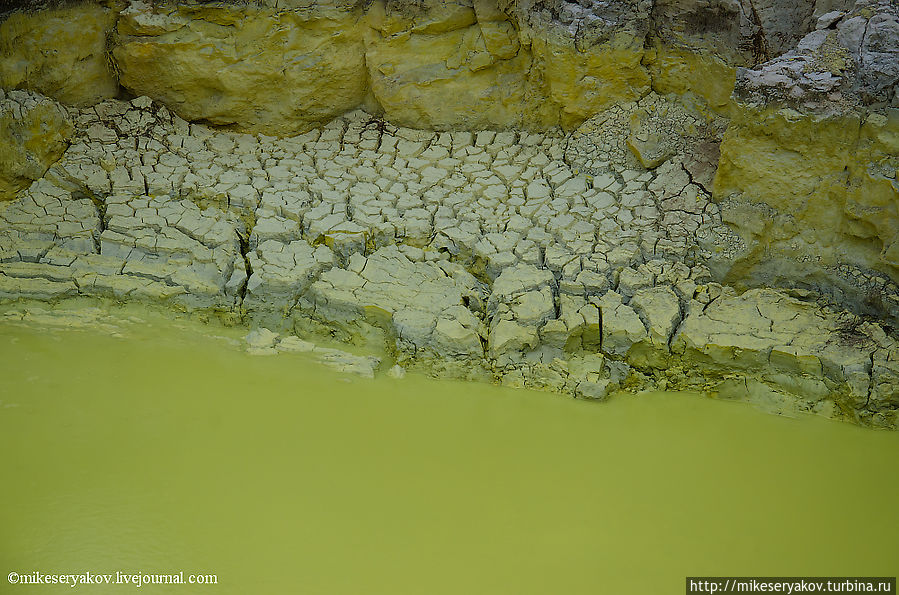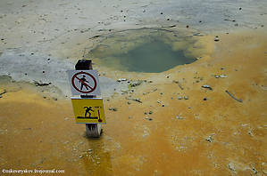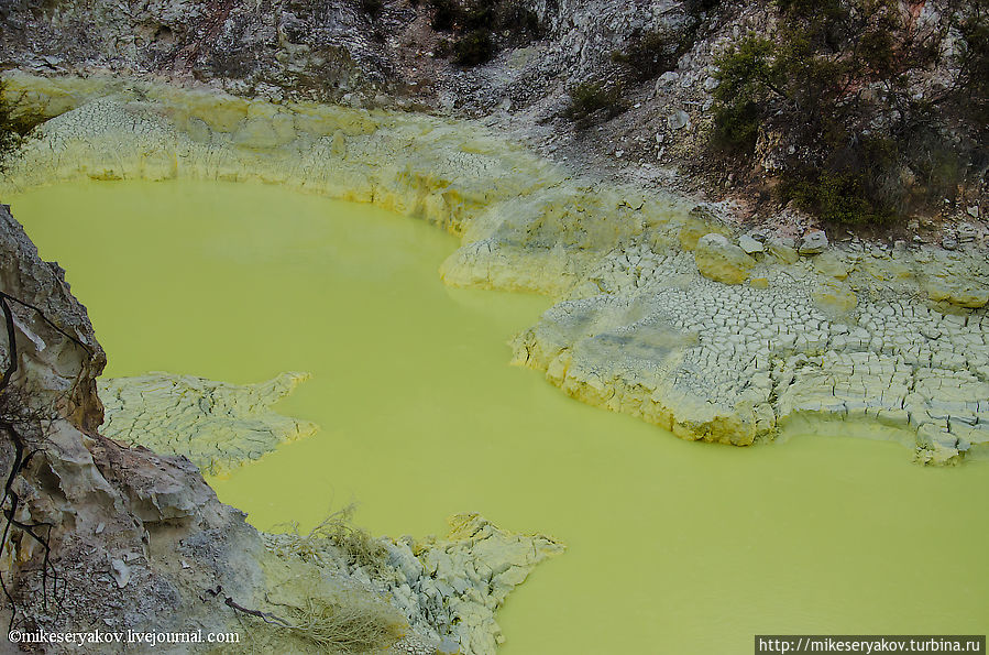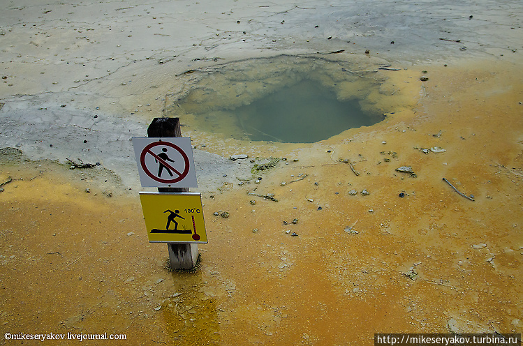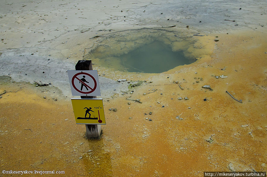 Это тоже одно из самых интересных мест гейзерового комплекса – удивительный желтый бассейн под номером 25 – «Ванна дьявола». Цвет воды совершенно уникальный.