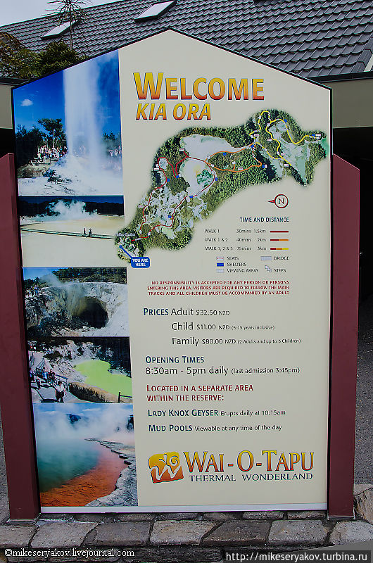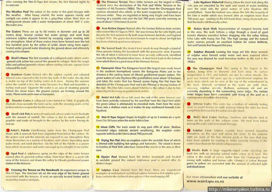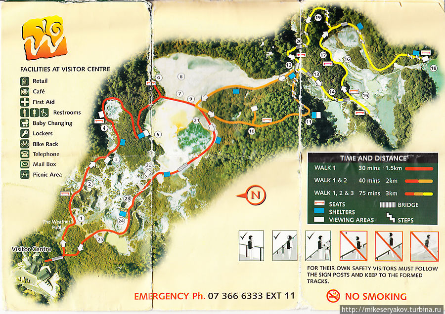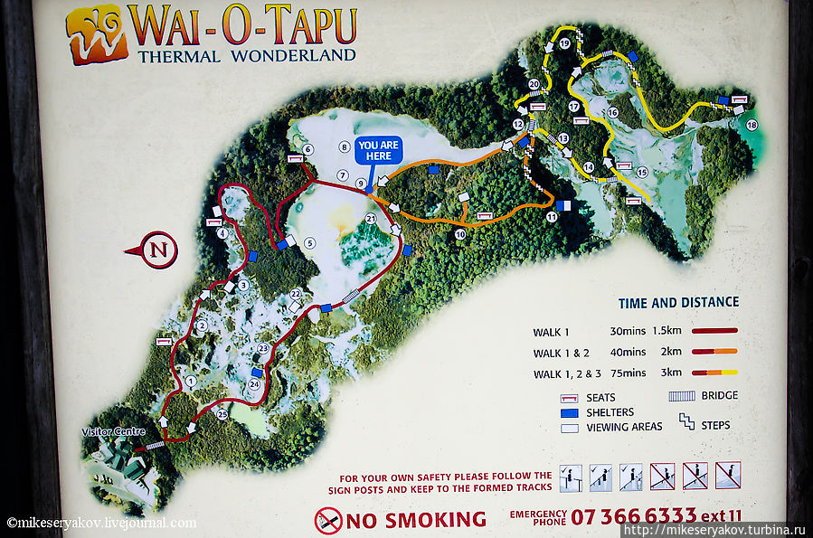 Сам парк Вай-о-Тапу. Его карта-схема, которая немного «подустала» во время прогулки по этому комплексу, из-за постоянного проливного дождя.