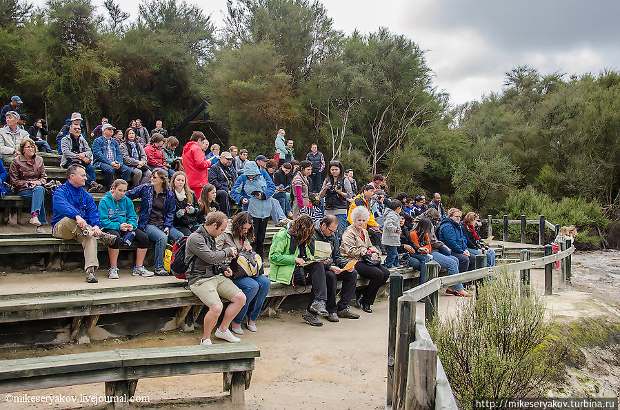 Сначала куча туристов в зрительном зале ожидают "ежесуточного" извержения этого источника, не заходя за деревянную ограду, за которой находится «сцена».