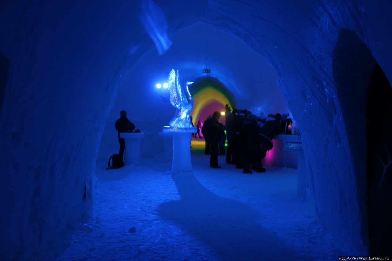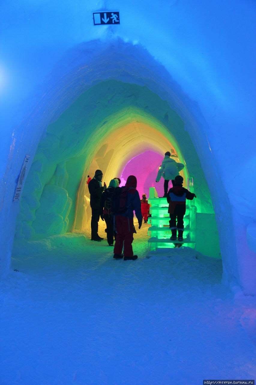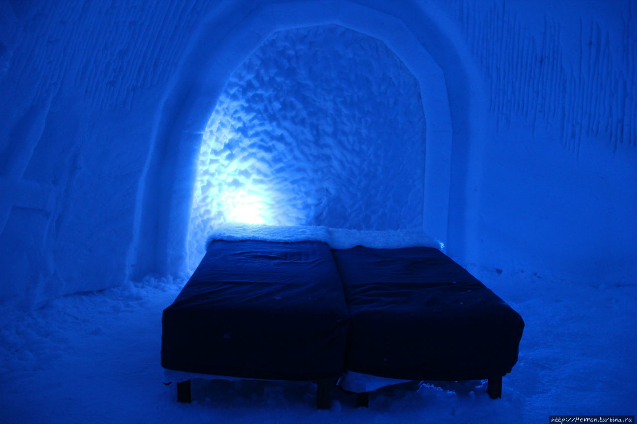 Внутри номеров имеется подсветка, пара кроватей, из стен вырезаны снежные фигуры. Вот и весь интерьер. Гигиенические процедуры можно провести в главном здании.