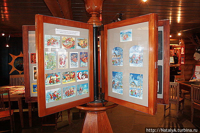 Почта очень красиво оформлена внутри. Почтальоны за прилавком одеты в длинные войлочные колпаки, есть большой стол, за которым можно удобно расположиться и с чувством написать свой привет на открытке, которые продаются здесь же в большом выборе и с очень заманчивыми видами Лапландии. И марка, и открытка, и отправка, всё будет стоить вам евровых денег. Примерно отправить такое письмо стоит в целом 10€.