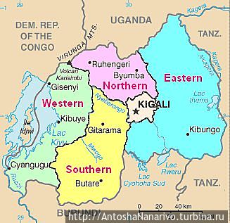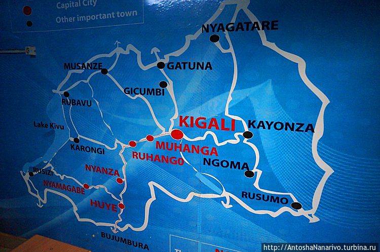На заглавной картинке показана карта Руанды с кигальского автовокзала с правильными названиями (фото сделано на месте пару недель назад), на нижней – из английской Википедии (на 6 декабря 2012 года) с названиями старыми, и городов на ней показано чуть меньше, но все основные есть. Нетрудно видеть, что совпадает на этих картах только одно – сама столица Кигали.