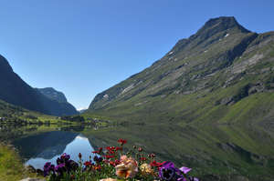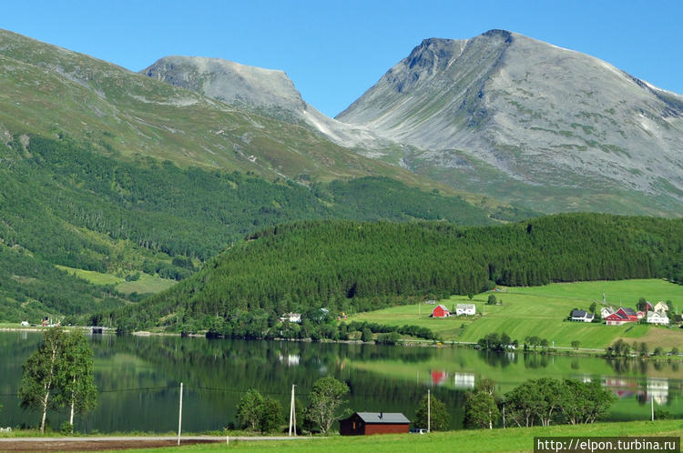 Наша дорога к острову Рунде началась от фантастически красивого места. Поднявшись от Гейрангера горным серпантином и протиснувшись через скалистое ущелье, дорога вынырнула в долину. Между величественными холмами расстилалось озеро – совершенно прозрачное с ровной зеркальной поверхностью.