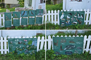 Предупредили, что надо одеться потеплее и поплотнее, и обуться в сапоги. Мы посомневались, ведь в кемпинге было тепло, сухо и безветренно. Но все-таки взяли сапоги и теплые куртки. И вот, пошли. В гору ведет узенькая асфальтовая дорожка. В её начале, на заборе, висят плакатики с описанием разных птичьих пород, обитающих на острове.