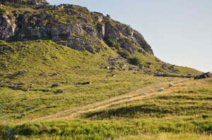 Нас обгоняет здоровенный немец с холеной спутницей – оба в легких футболочках и шортах. Дорожка доходит до овечьей калитки и за ней превращается в гравийную. А немного погодя – в грунтово-болотистую. Цивилизация кончилась – впереди отлогий склон с озерками и скальными выступами, теряющимися в море мелкой растительности. Весь склон плотно порос чем-то типа стелющегося вереска. Он рос тут веками, каждая новая поросль громоздилась на своих отживших растительных предков. Из-за этого плотного многовекового сплетения веточек вода с горных вершин не может стечь в океан – она насквозь пропитала вересковый ковер и превратила тропы в мясистую кашу.