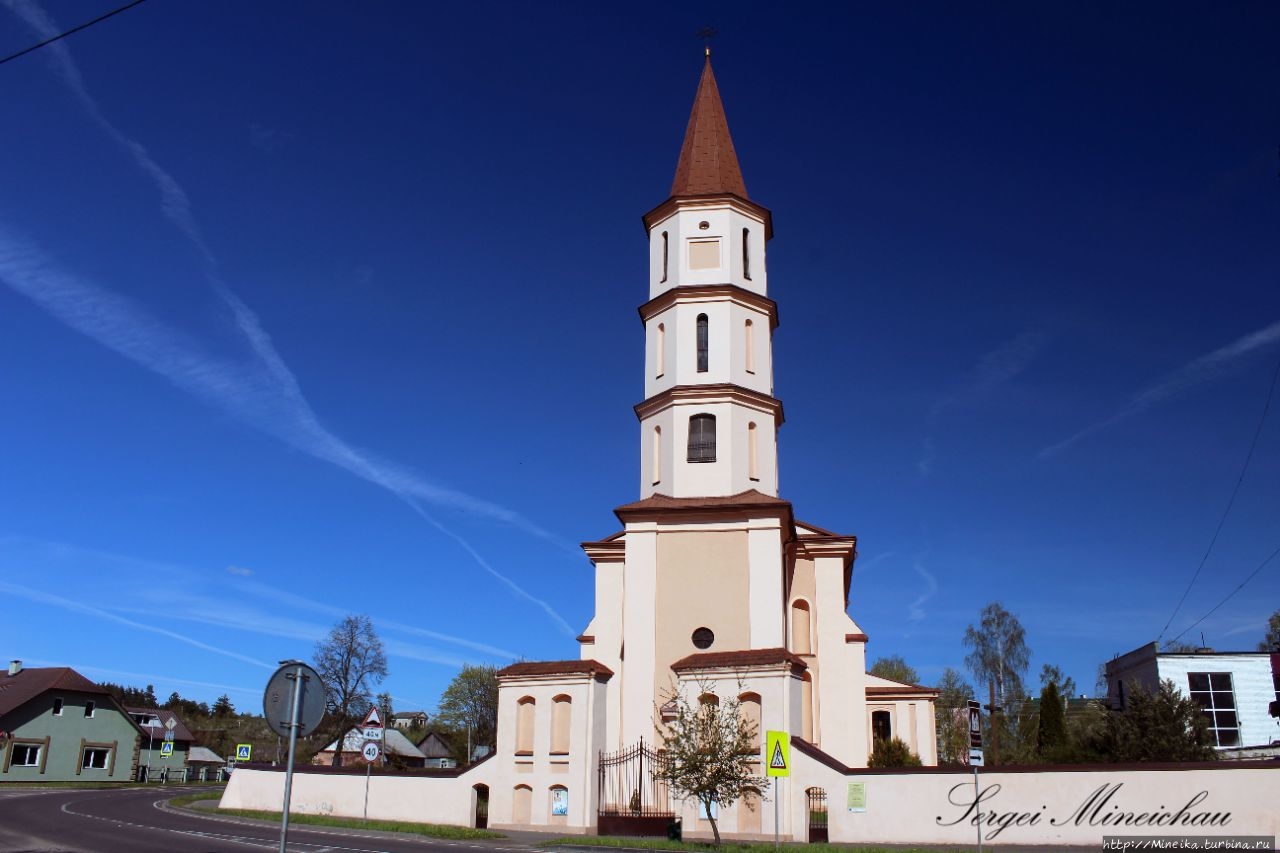 История возведения этого красивого костёла относит нас опять к Казимиру Льву Сапеге.В 1617 году на месте деревянного храма был воздвигнут новый, каменный. Как записано в княжеской хронике: «в честь Святой Троицы, Непорочного Зачатия Девы Марии и святых Петра и Павла».