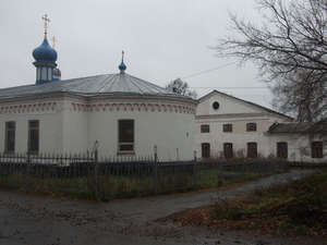 Церковь эта, в советские дни, черные для религии, остававшаяся единственной действующей в городе, размещается на юго-западной окраине города, посреди кладбища. Строили ее в 1860-х годах, и от многочисленных перестроек и пожаров — судьбы многих храмов тех лет постройки — ей удалось спастись, отчего замысел неизвестного мне архитектора остался в первозданной красе. Белый с синими обводами храм имеет приземистый основной купол, и несколько странную колокольню, ее верхний ярус почему-то не обычный…