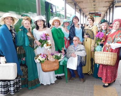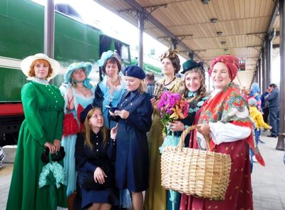 На перроне рыбинского ж/д вокзала было не протолкнуться от публики. Публика пришла посмотреть не только на паровоз полувековой давности. Лично я, поглазев на паровоз, пялился на красавиц барышень, одетых по дореволюционной моде. Они меня встретили-приветили, сфотографировались на память.