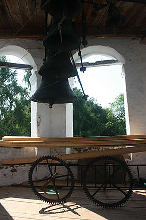 В Угличе летом мы еще не были, приехали любоваться видами Волги в зелени и забраться на колокольню. Вход на колокольню стоит 50 рублей, в принципе там смотреть нечего, но при этом там есть совершенно потрясающая экскурсовод, увлеченная своим делом, которая попросила нас задержаться и посмотреть на механизм, который бьет в колокола! Удивительное дело!