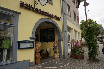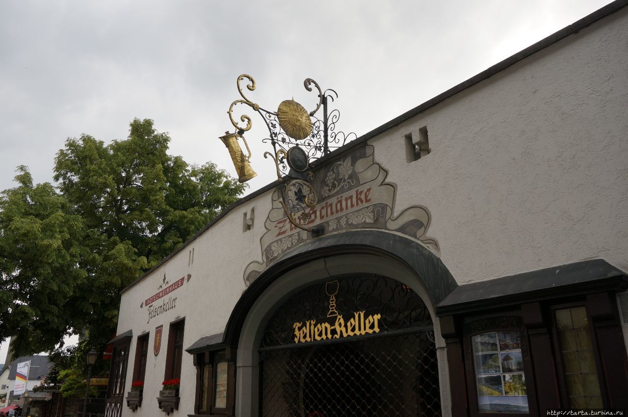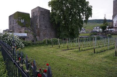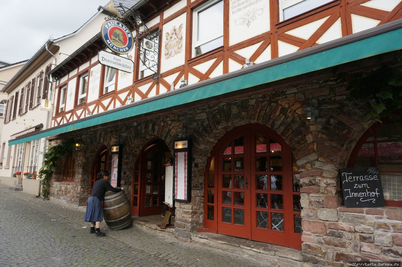 Кроме того здесь есть и Музей вина, открытый с 1950 года. В него мы, к сожалению, опоздали. Rheingauer Weinmuseum, где представлены все атрибуты производства вина от давильных прессов до пробок и кубков, разместился в стенах самого старого в этих местах замка Brömserburg (вернее то, что от него осталось). Изначально, примерно в 1112-1113 г.г. здесь у реки была таможня, гарнизон крепости занимался сбором пошлин с судов, пополняя тем самым городскую казну.