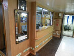 Итак, сердце парохода — это ресепшен. Здесь всегда кто-то дежурит, отсюда озвучиваются объявления по громкой связи, и, самое главное, девушки в любое время суток предоставят вам..... кипяток! Никаких чайников в каютах нет, дабы во время шторма люди себя не обожгли себя кипяточком. Столовая на корабле есть — комплексная еда там довольно простая, но при этом сытная и вкусная. Впрочем, если верить меню, в столовой можно заказать и что-то более изысканное. Есть также и бар, где крепкие спиртные напитки не продают, а цена на чипсы и на сухое вино зашкаливает.