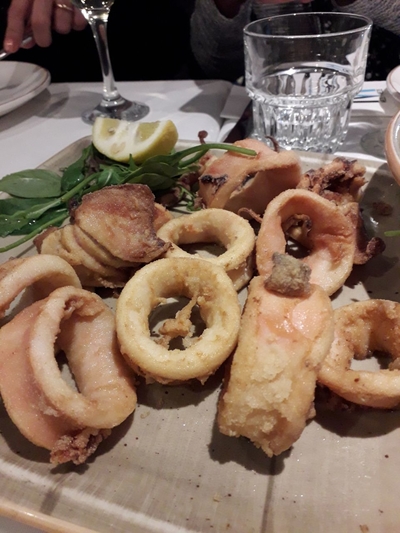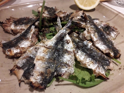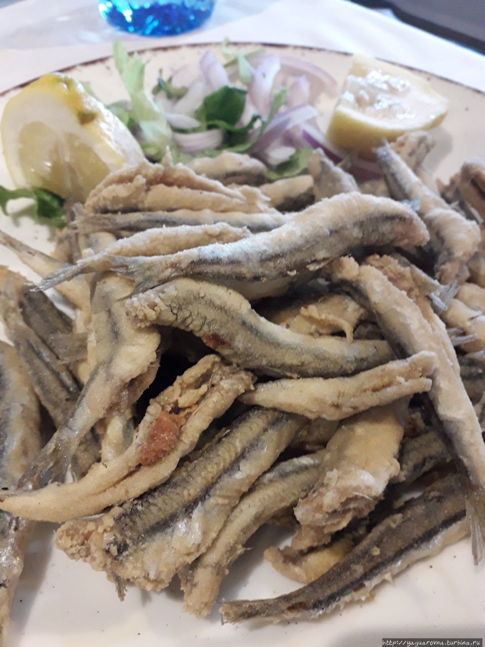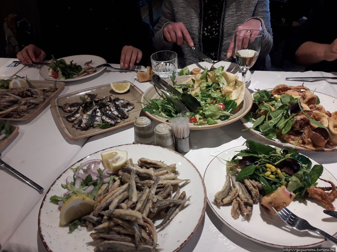 Если поподробнее, то сардинки , мелкая бэби-фиш, название которой я не воспроизведу , кальмары кольцами , ассорти мелюзги морской , и греческий, он же деревенский салат с непременной дзадзикой и домашним вином.