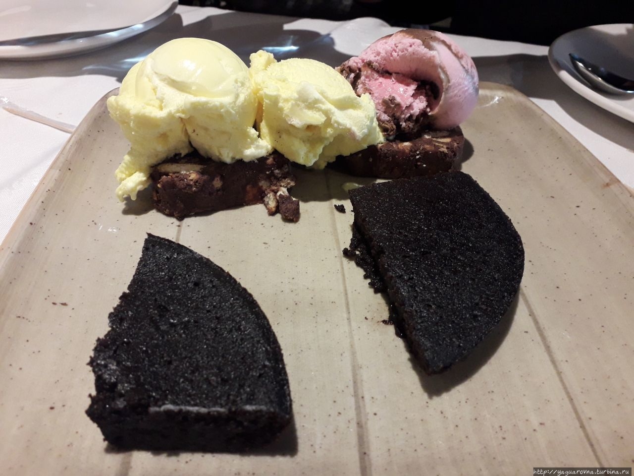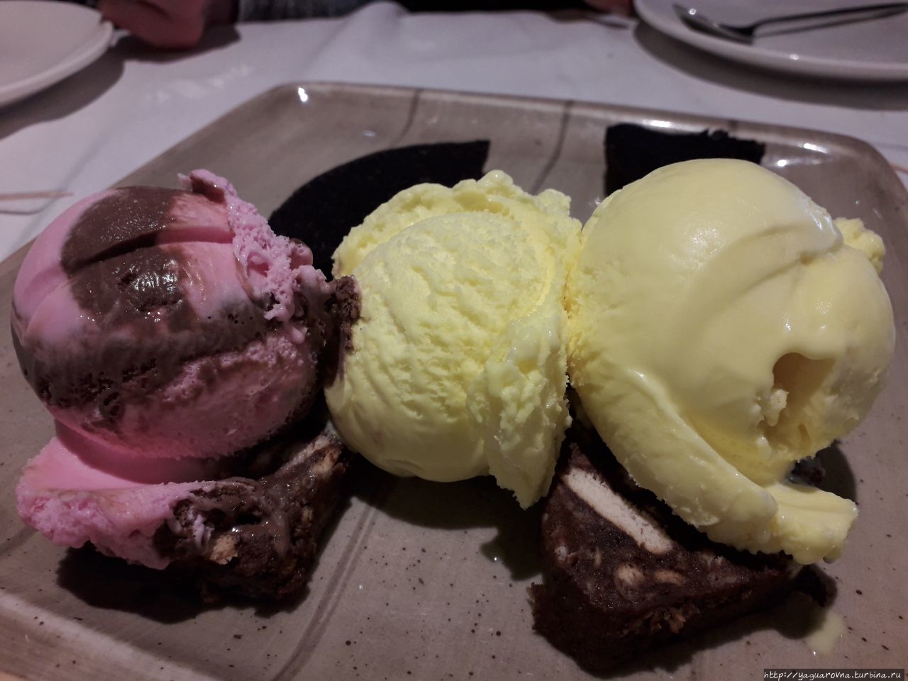 Мороженое в ассортименте и пирожное-коврижка. Честно говоря, своим заказом мы более чем насытились, запихивали презент-комплимент заведения в себя по двум причинам: было вкусно и хотелось дать понять персоналу, что мы довольны. Чаевыми мы тоже это отразили, само собой ))
