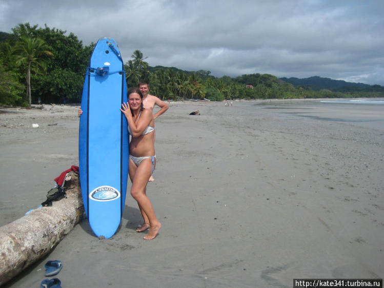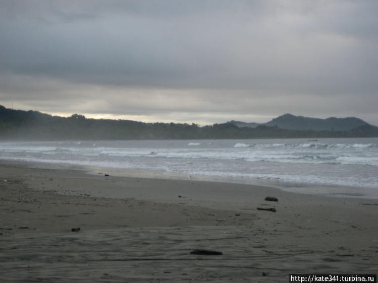 Пришли Дима и Маша, и мы релаксировали между крабами и волнами. Солнце, несмотря на ветер, сильное, лицо к вечеру подрумянилось. Мы пообедали вкусностями — окунеподобной рыбой, чаем, спагетти. Не зря нашли местную забегаловку. Потом ребята заказали местную поездку в Остиональ смотреть черепах. Я почти тоже согласилась, когда узнала, что со мной цена будет по 30 баксов. Чтобы попасть туда надо в начале 1,5 часа трястись в пикапе в одну сторону. Вдруг я подумала, что хватит с меня черепах, и осталась в Самаре. Урок серфинга стоит 30 баксов. Дорого, но захотелось. Ребята уехали, а я пошла гулять по пляжу. Под вечер нарисовался очень красивый розовый закат. Я села на бревно и наслаждалась зрелищем, периодически отодвигая бревно подальше от прибывающей воды.