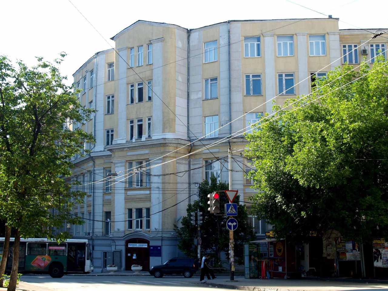 Главное здание Инженерно-Строительного Института, на углу Молодогвардейской со стороны Волги — демонстрирует дополняющий до 180 град. развёрнутый угол.