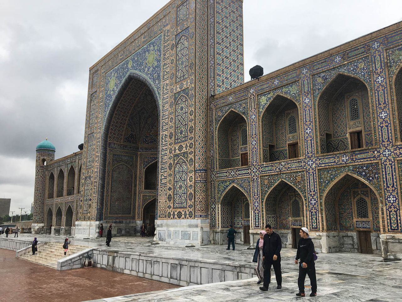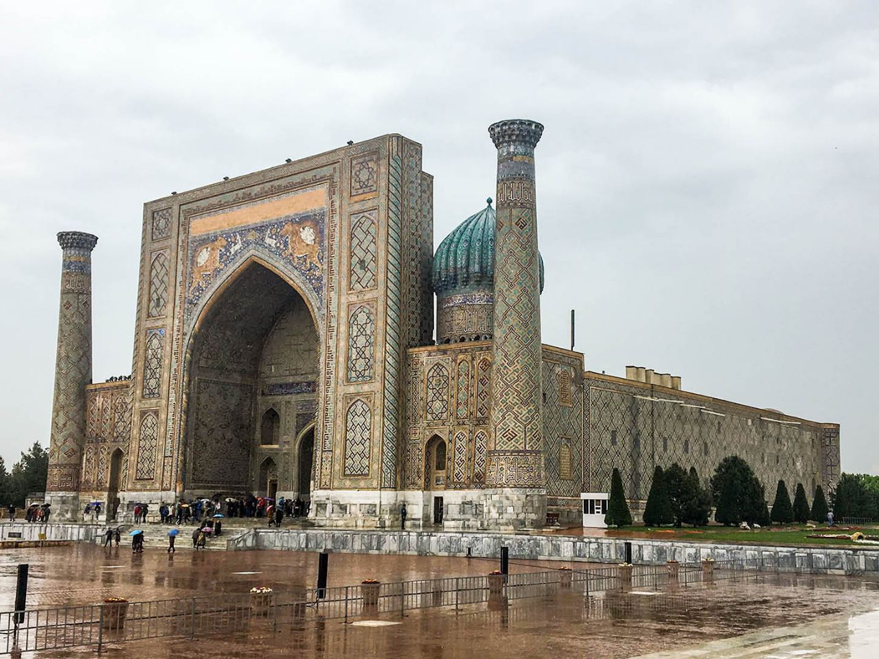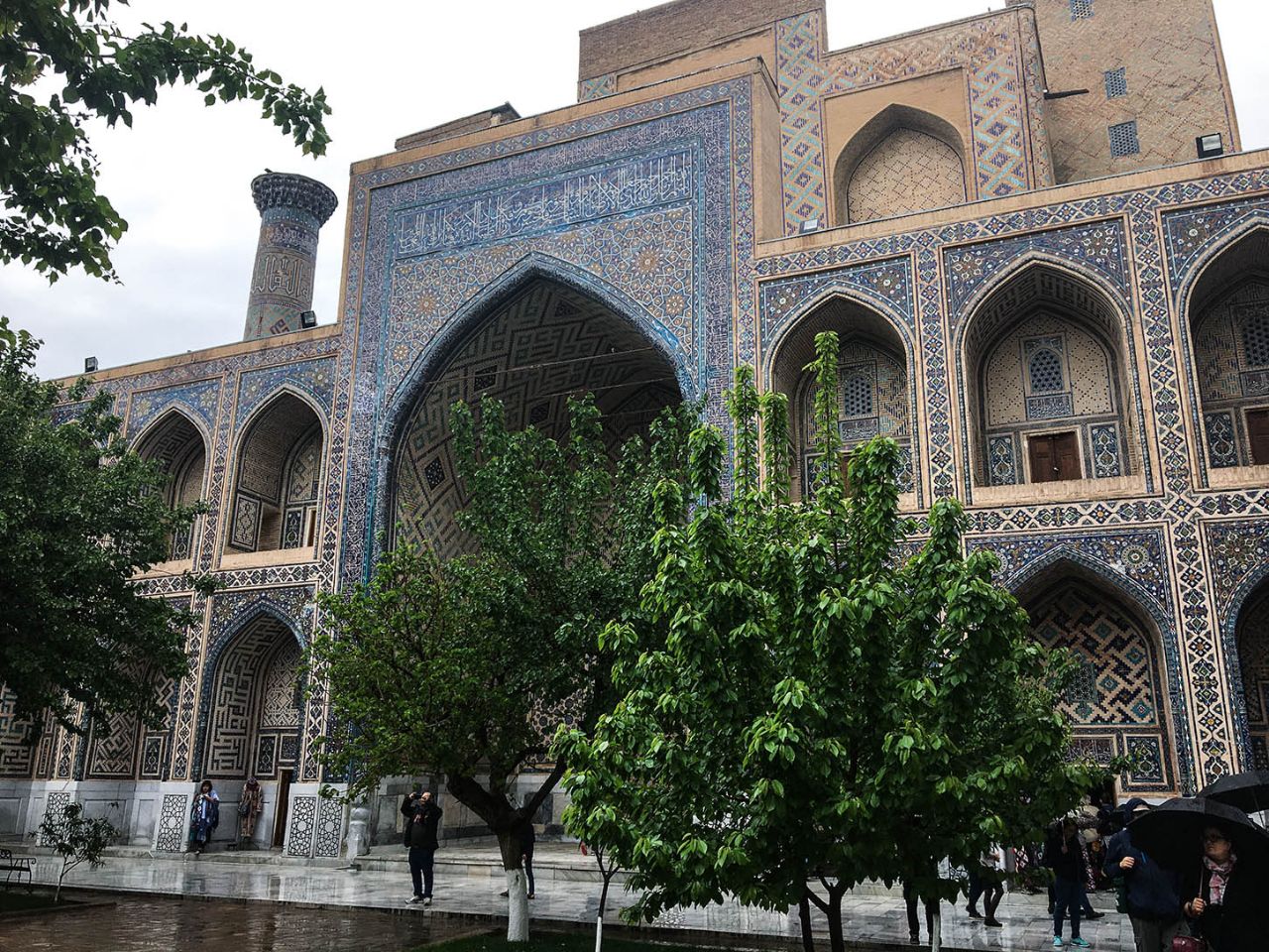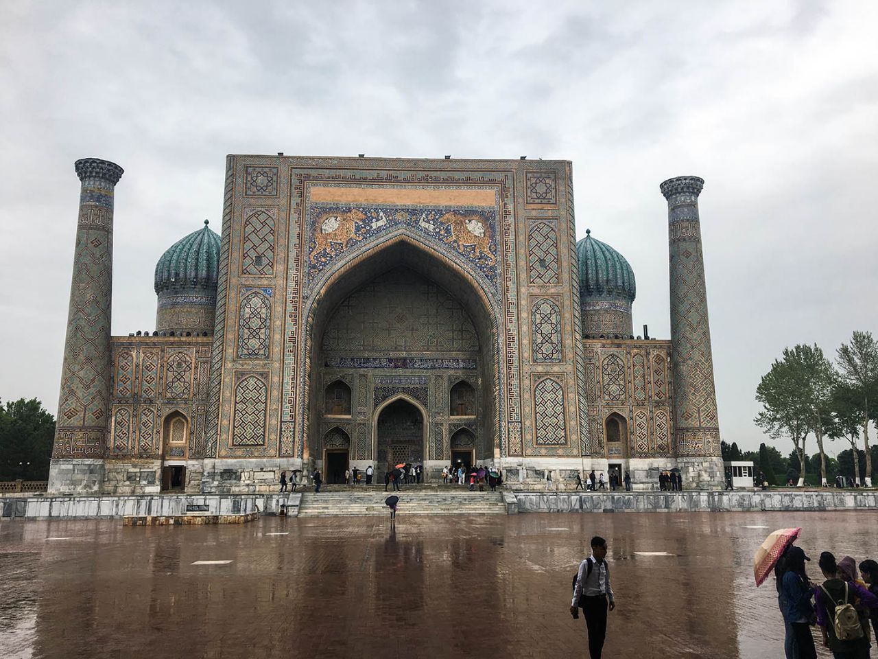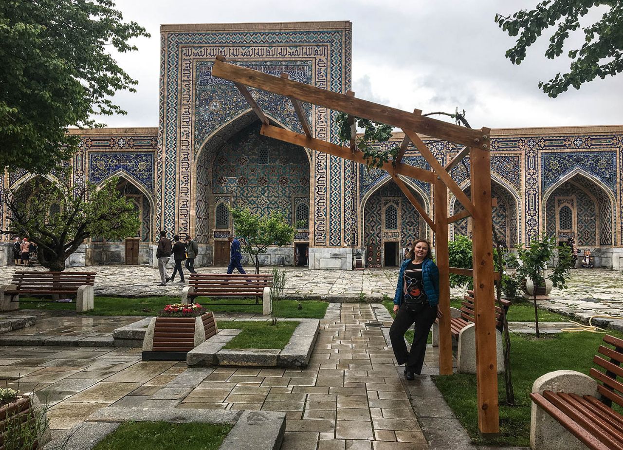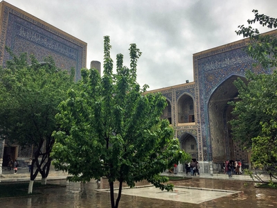 Впрочем, восторгаться архитектурой, едой и местным колоритом это ничуть не помешало. Пусть и под дождем, который то сыпал мелкой крупой, то выпускал длинные душевые струи, мы долго гуляли по знаменитой самаркандской площади и подробно осматривали формирующий её архитектурный ансамбль из трёх медресе.