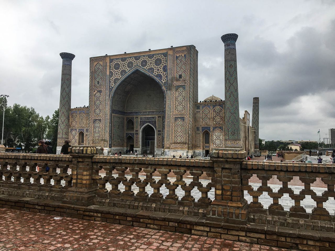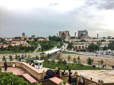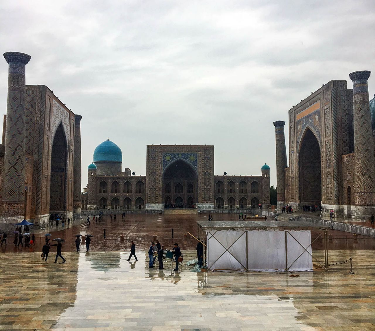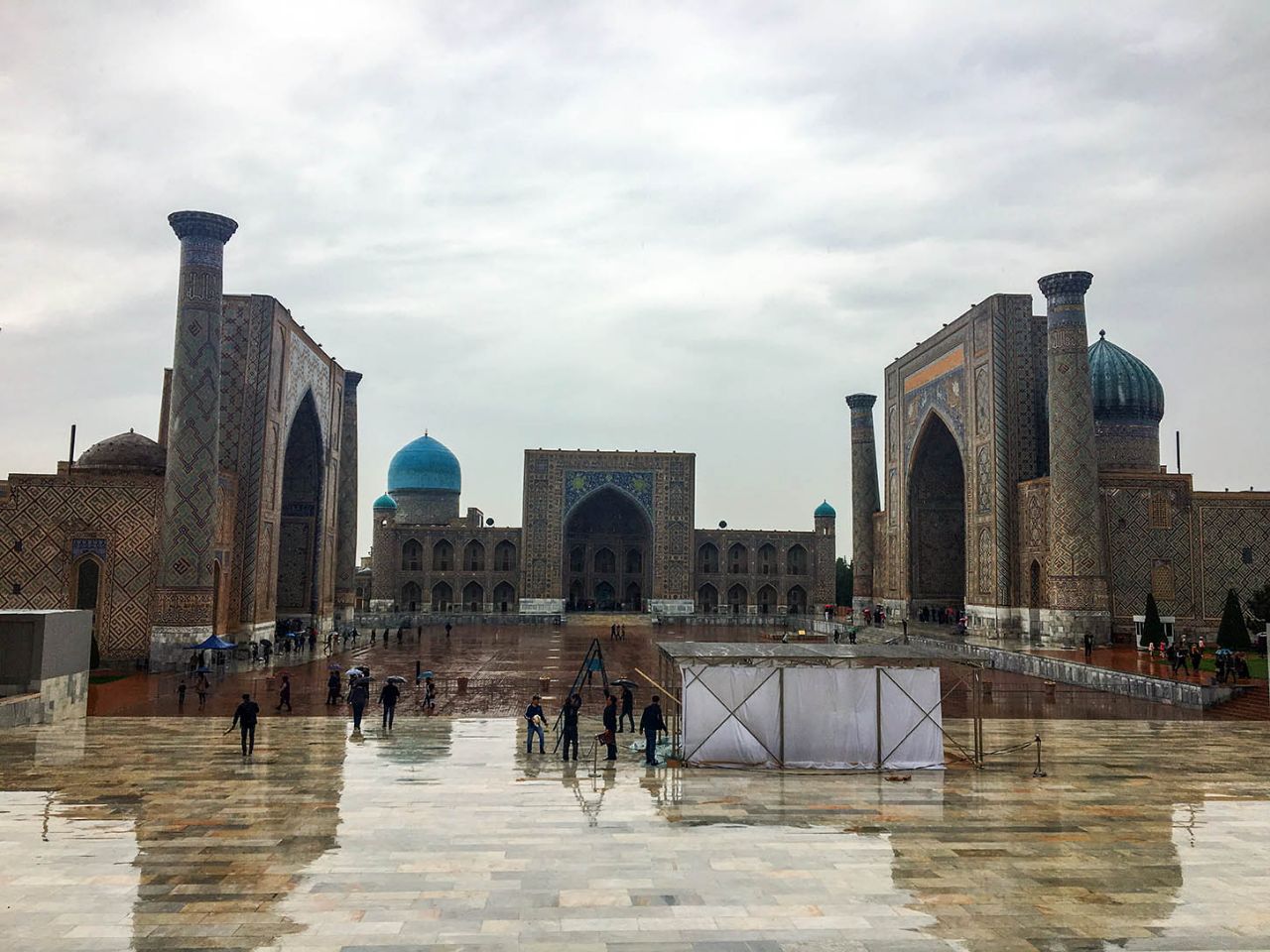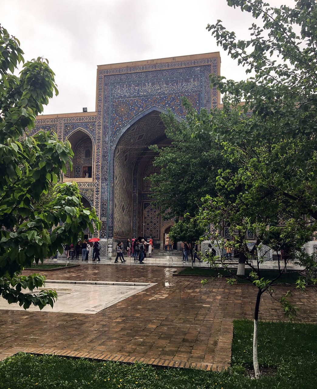 Впрочем, восторгаться архитектурой, едой и местным колоритом это ничуть не помешало. Пусть и под дождем, который то сыпал мелкой крупой, то выпускал длинные душевые струи, мы долго гуляли по знаменитой самаркандской площади и подробно осматривали формирующий её архитектурный ансамбль из трёх медресе.