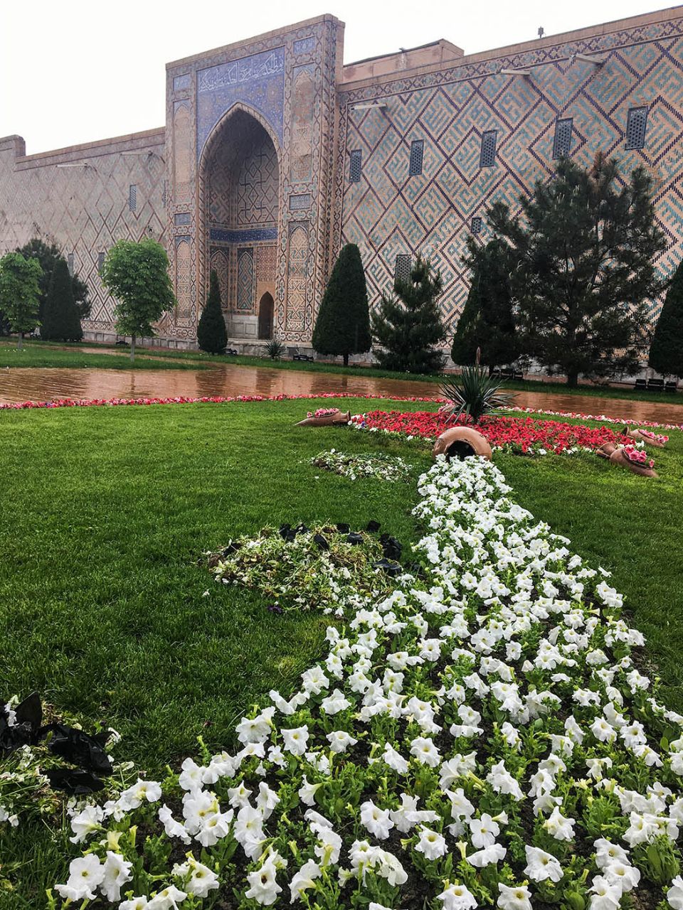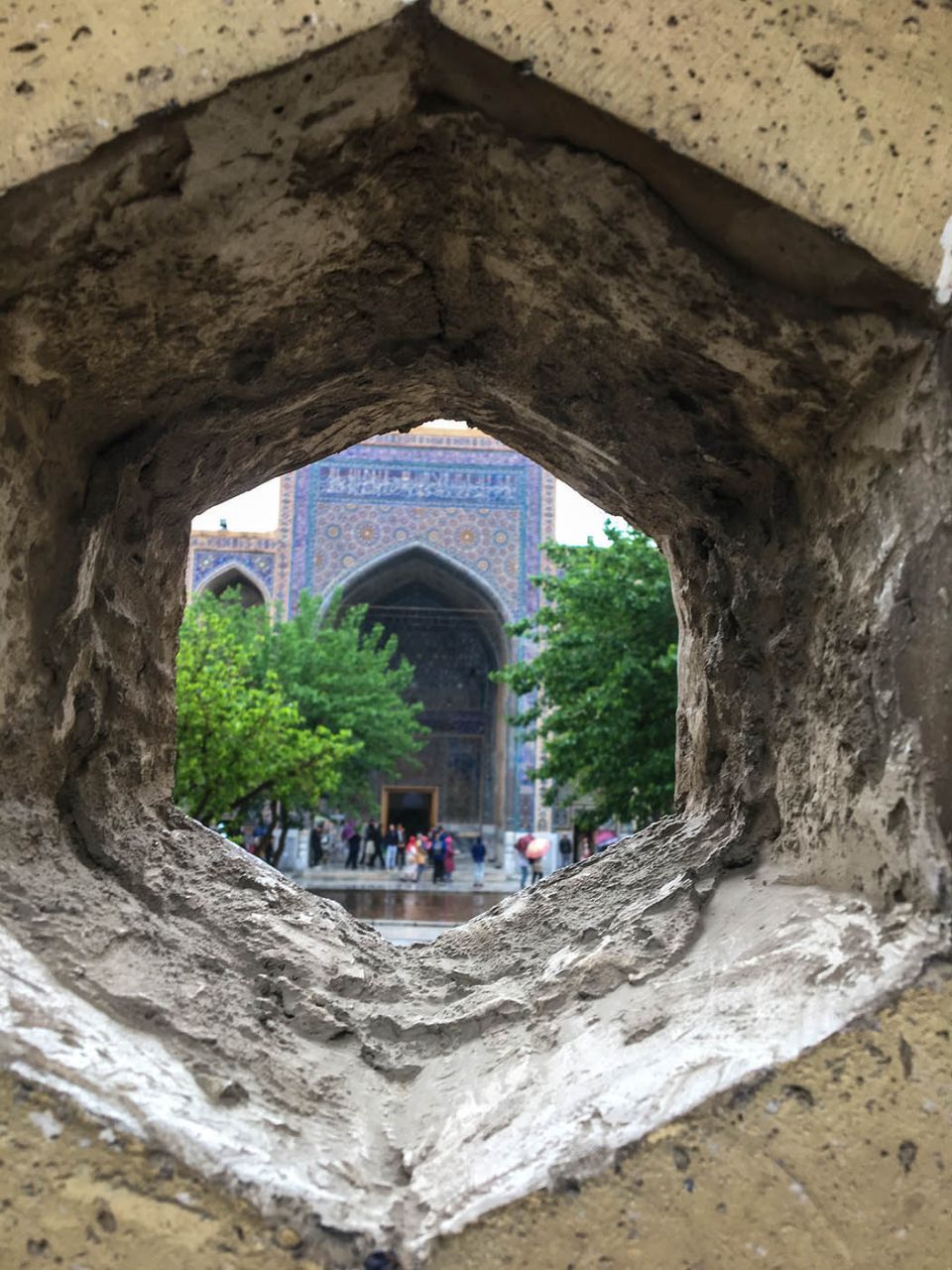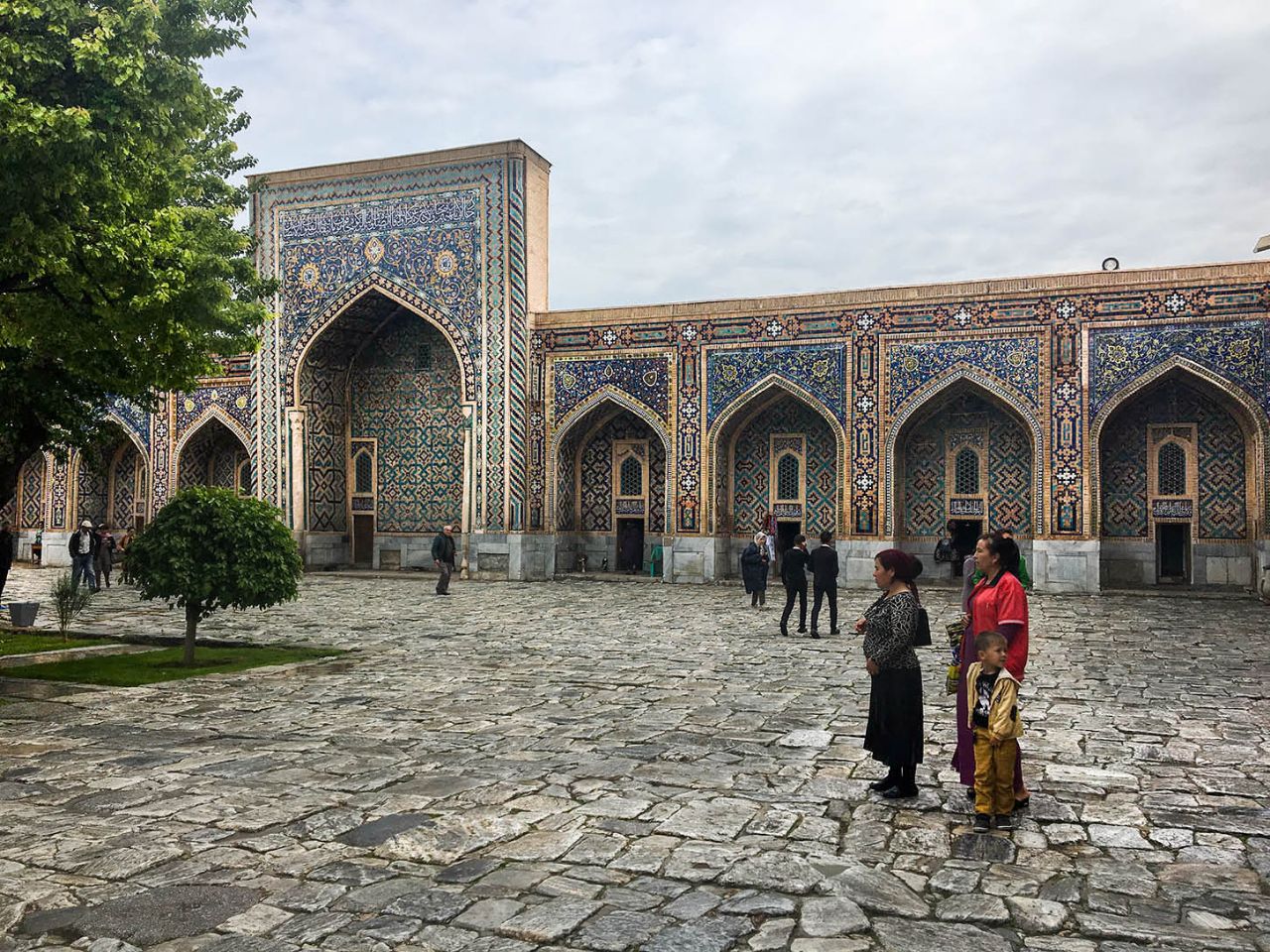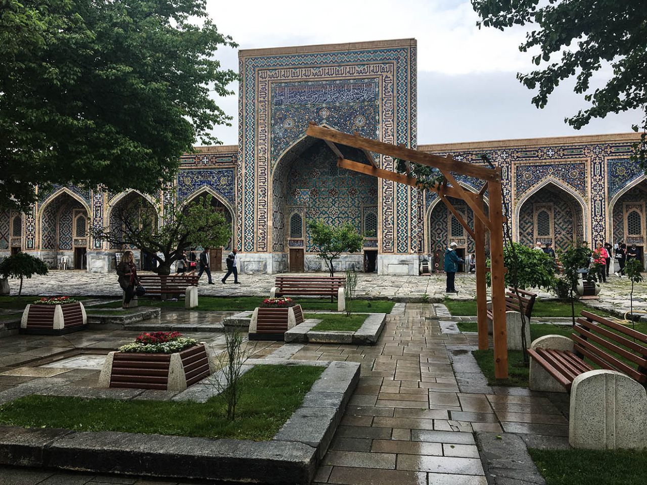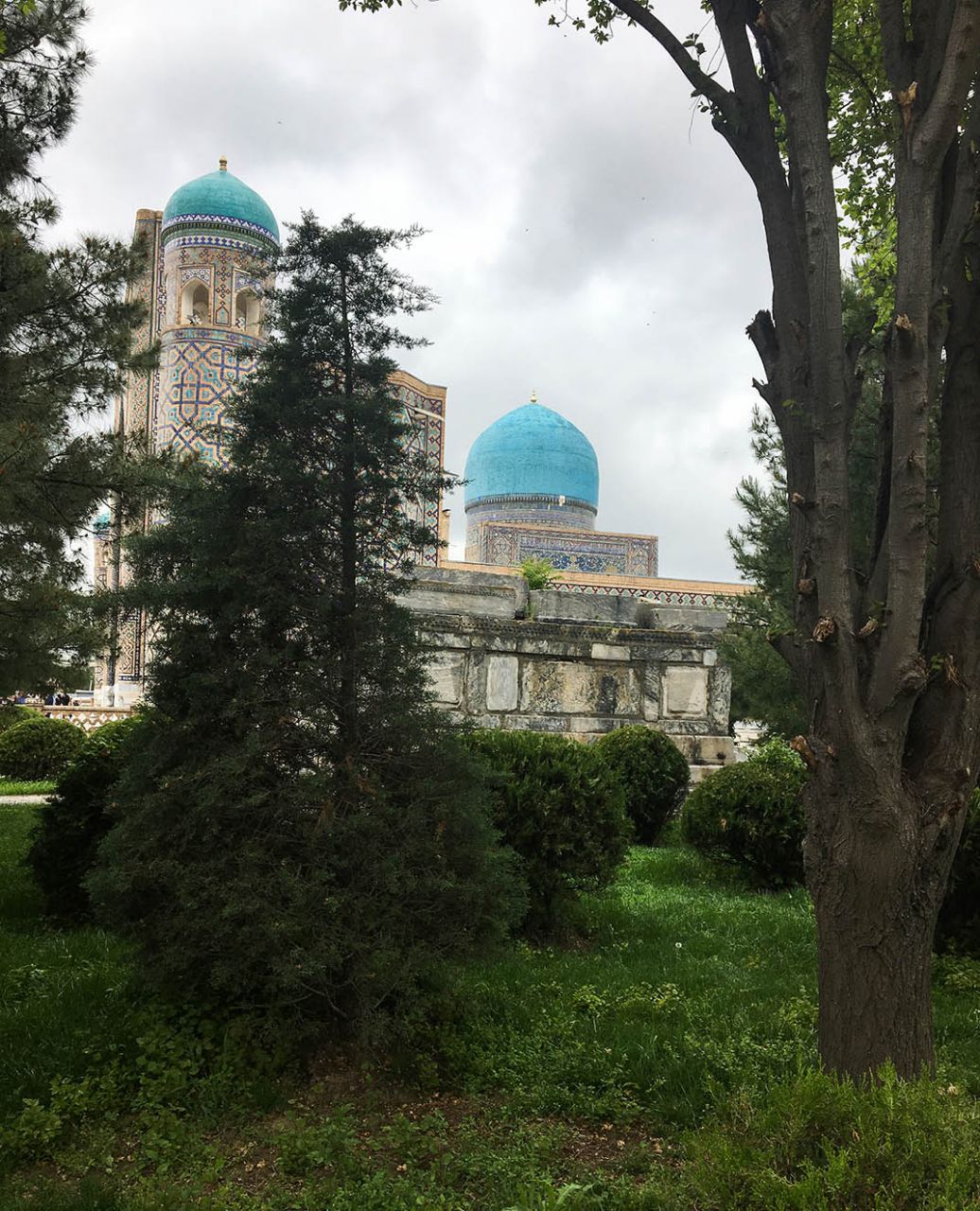 Впрочем, восторгаться архитектурой, едой и местным колоритом это ничуть не помешало. Пусть и под дождем, который то сыпал мелкой крупой, то выпускал длинные душевые струи, мы долго гуляли по знаменитой самаркандской площади и подробно осматривали формирующий её архитектурный ансамбль из трёх медресе.