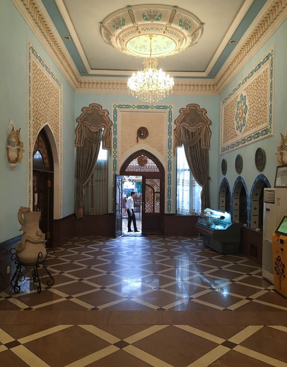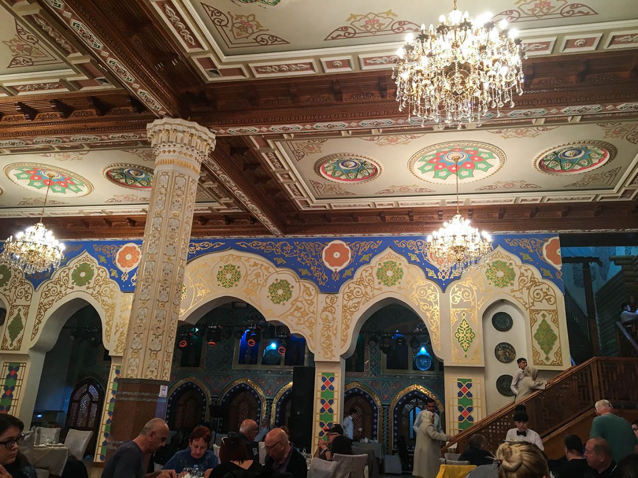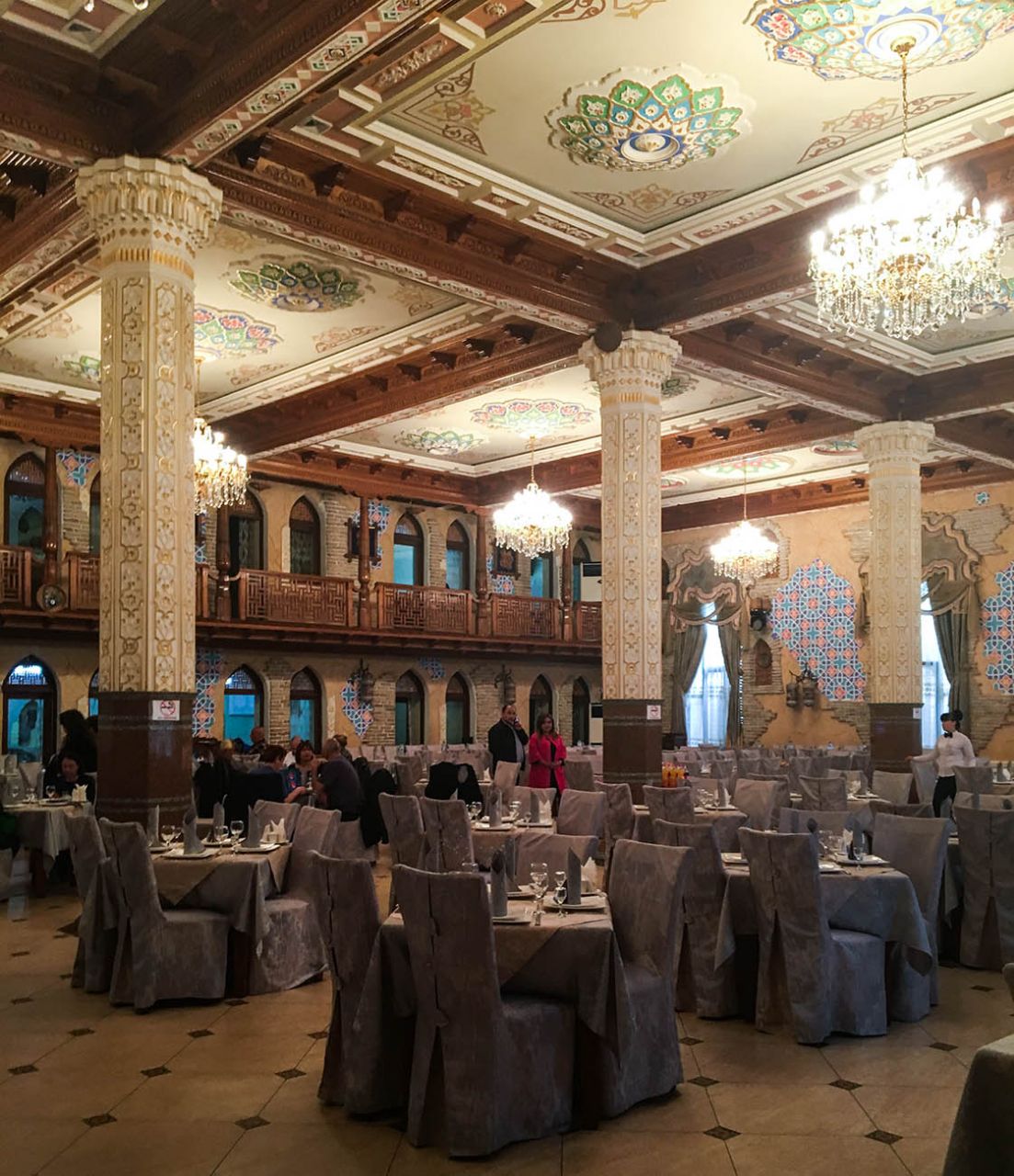 Если не брать в расчёт чрезмерную позолоту на фасаде, то здание кафе ничем не выбивалось из общего ряда. Внутри же нас ожидали почти дворцовые интерьеры. Широкий парадный вестибюль вёл в богато украшенный зал, повсюду была лепнина, фрески с восточными миниатюрами, расписные колонны и т.д. и т.п. 🙄
