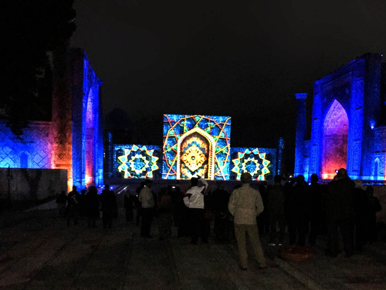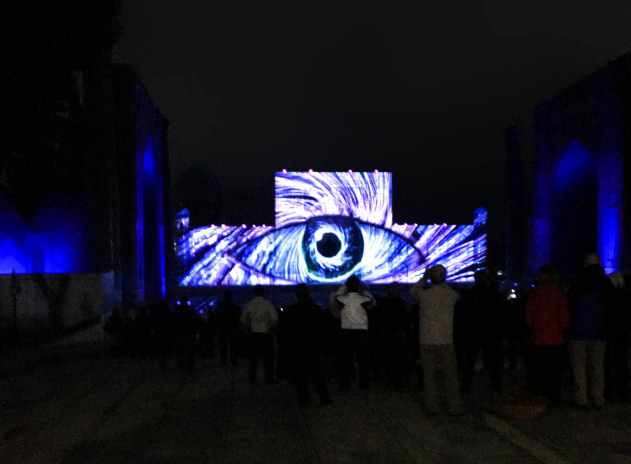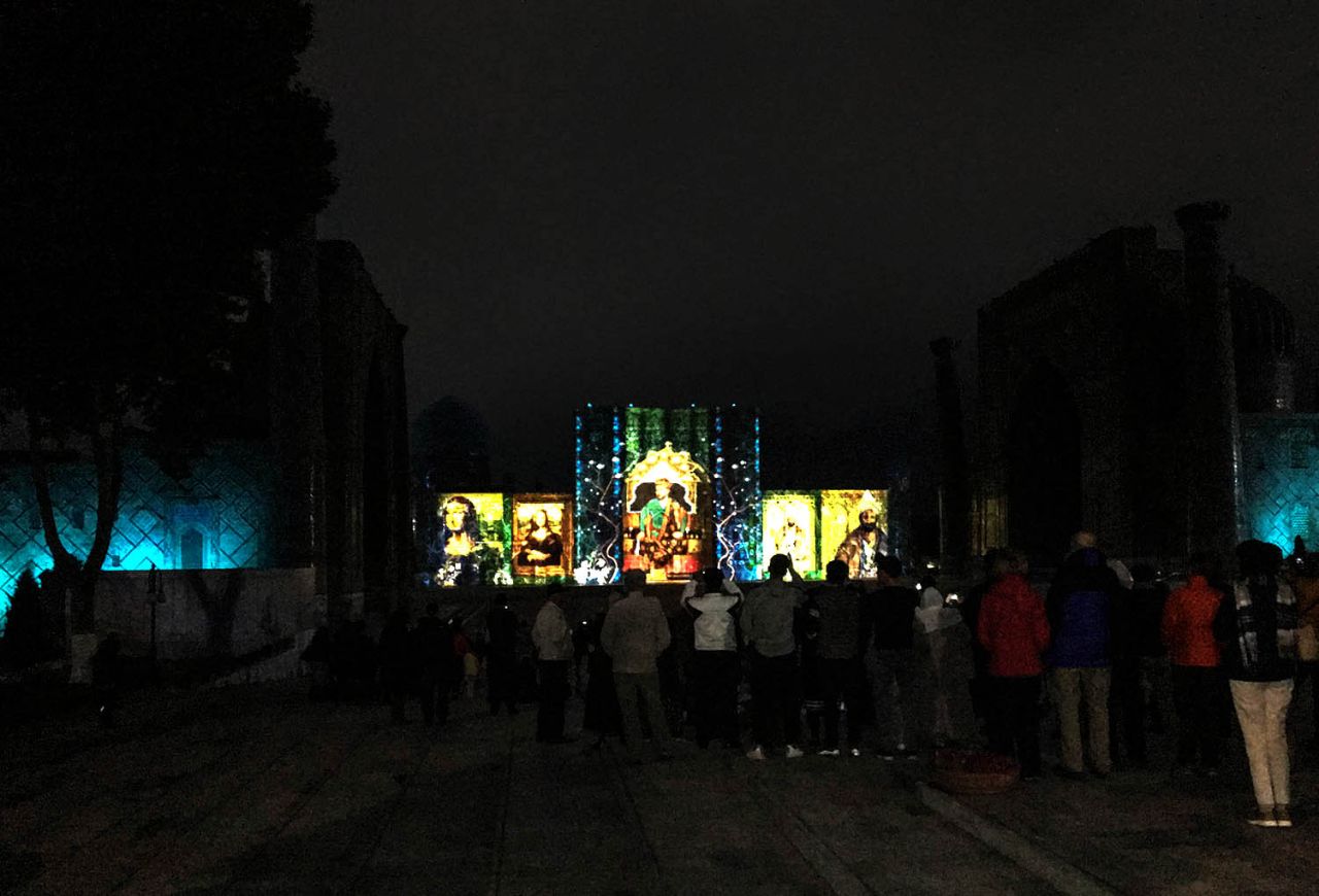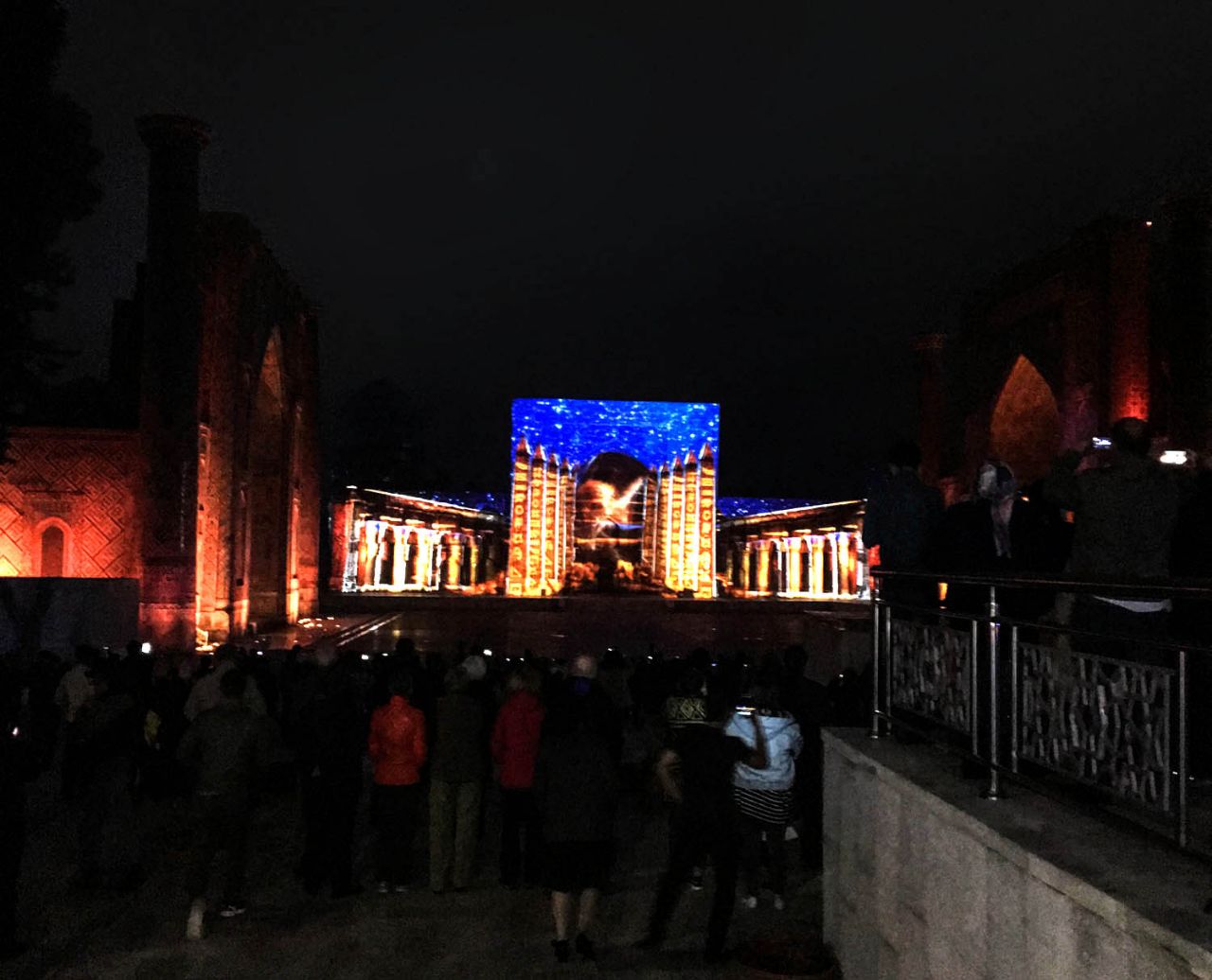 Это было красиво, только долго мокнуть под дождем не хотелось, и мы уже собрались было уезжать, но ждал настоящий сюрприз. Свет погас, заиграла музыка, и вдоль фасадов медресе поплыли сначала призрачные, а затем все более четкие картинки лазерного шоу.