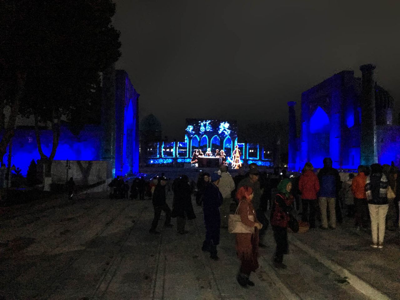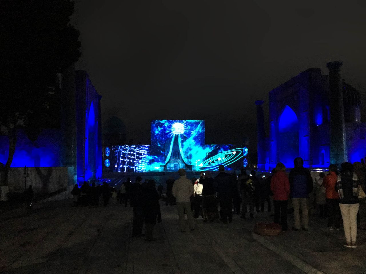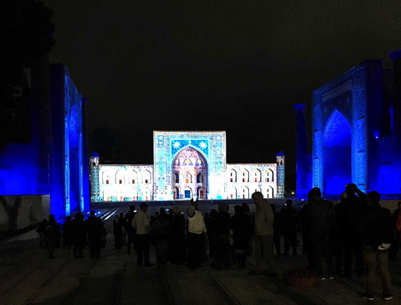 Это было красиво, только долго мокнуть под дождем не хотелось, и мы уже собрались было уезжать, но ждал настоящий сюрприз. Свет погас, заиграла музыка, и вдоль фасадов медресе поплыли сначала призрачные, а затем все более четкие картинки лазерного шоу.