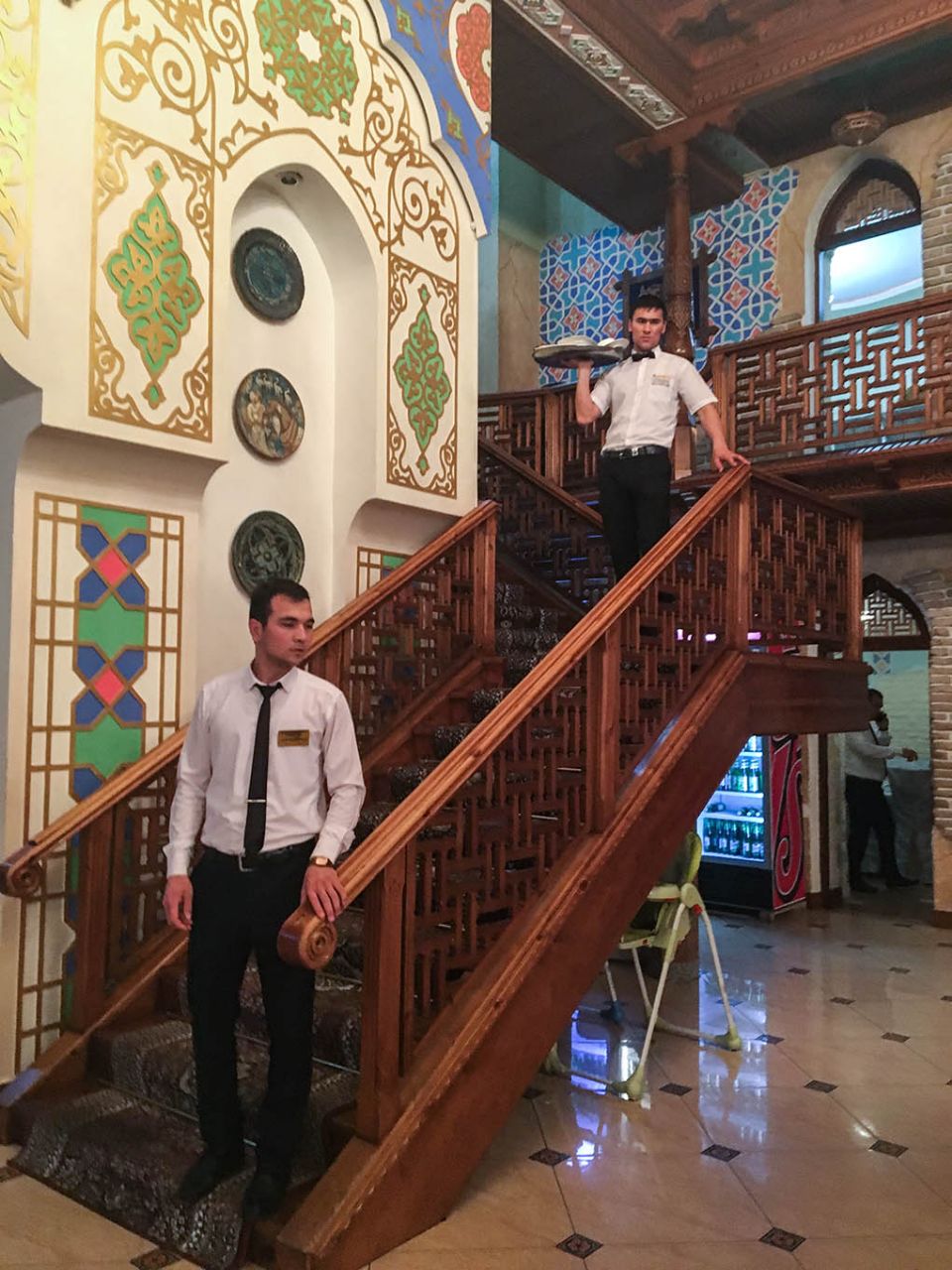 У них ведь как заведено? Внутри дома явное тяготение к роскоши, а сразу за порогом начинается помойка. Узбекская действительность стала приятным исключением из правил. Правда, только в плане того, что «за порогом», а вообще любой интерьер и любое мероприятие здесь пытаются обставить значительно шикарнее, чем оно того заслуживает. Но это, конечно, вопрос менталитета. Так, например, в первый же день мы остановились пообедать в неком придорожном кафе:
