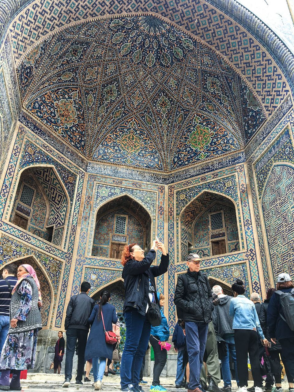 Ну, да ладно. Я по арабски ни в каком варианте читать не умею, а потому очень быстро отвлеклась от заложенной в камень вековой мудрости на окружающий мир. То есть на народ. С первого же дня впечатлило, как сильно в Узбекистане развит местный туризм. Повсеместно, на каждом объекте рядом с нами находились целые группы школьников, студентов или взрослых людей.