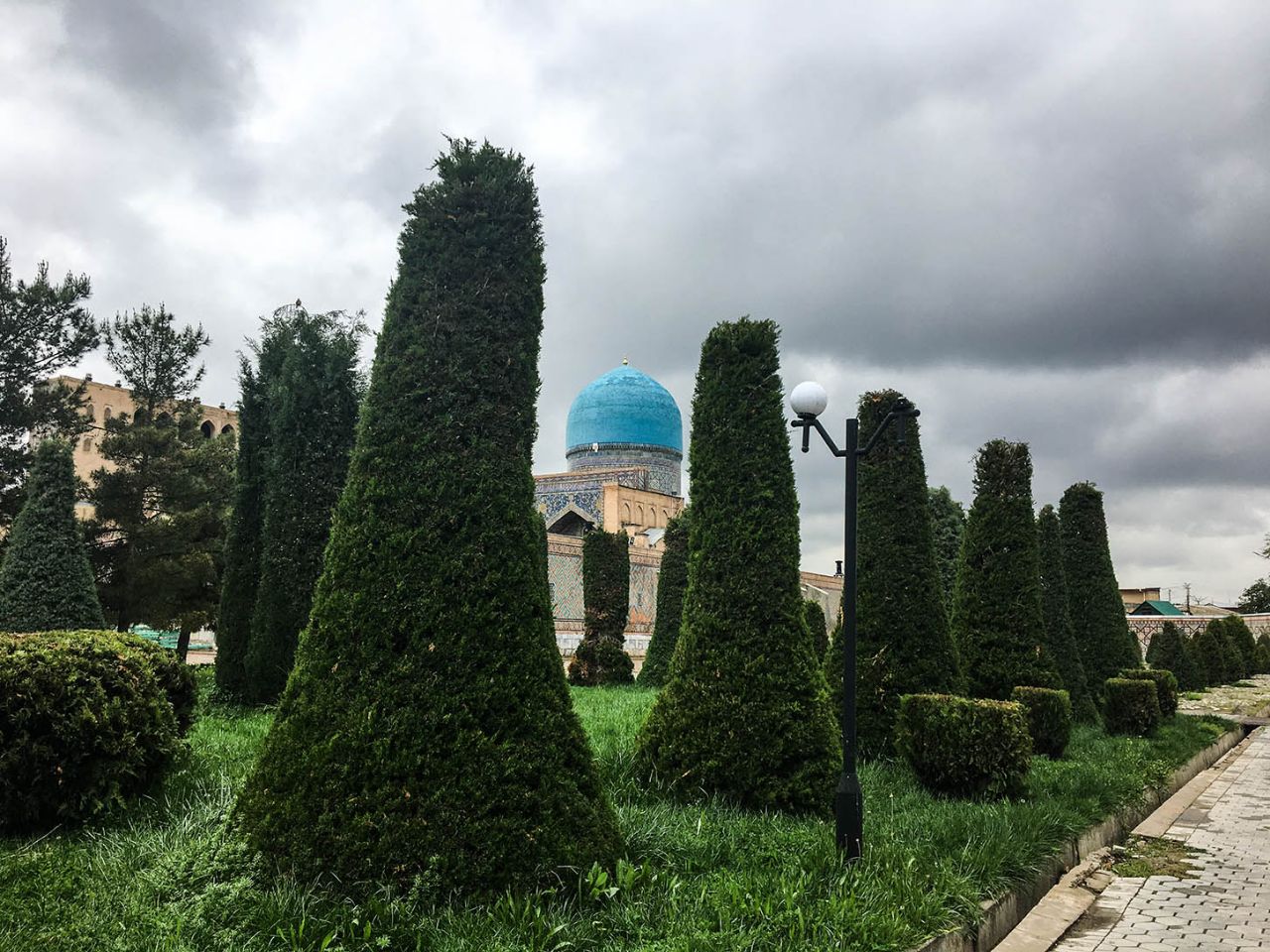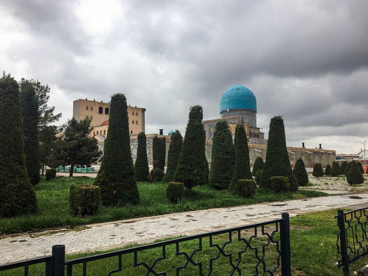 В действительности на современной площади Регистан в Самарканде мы не заметили ни песчинки. Более того, омытая дождем, она сверкала, как зеркало.