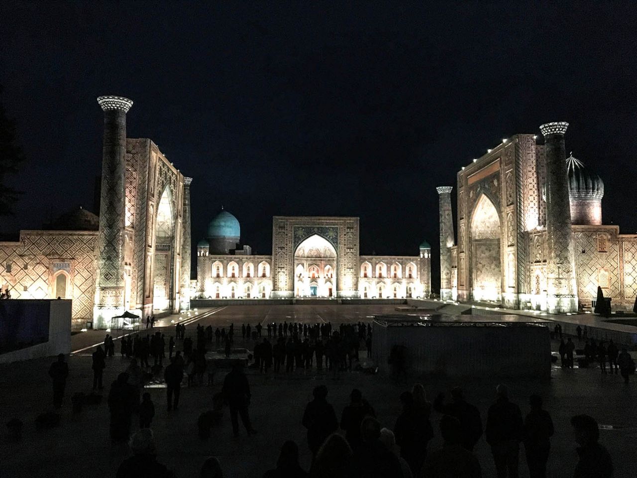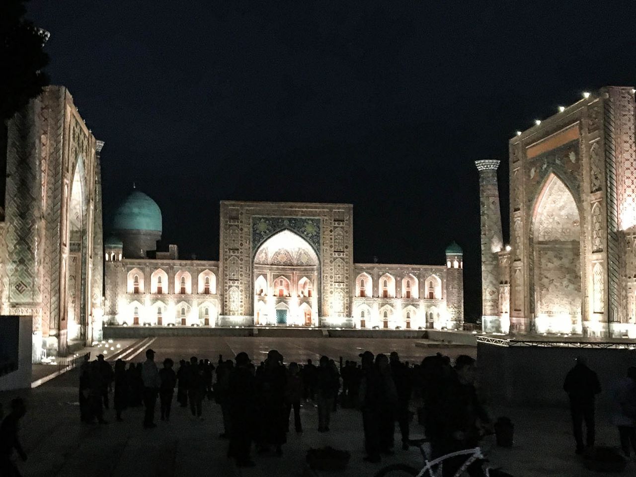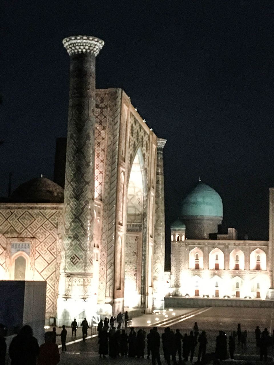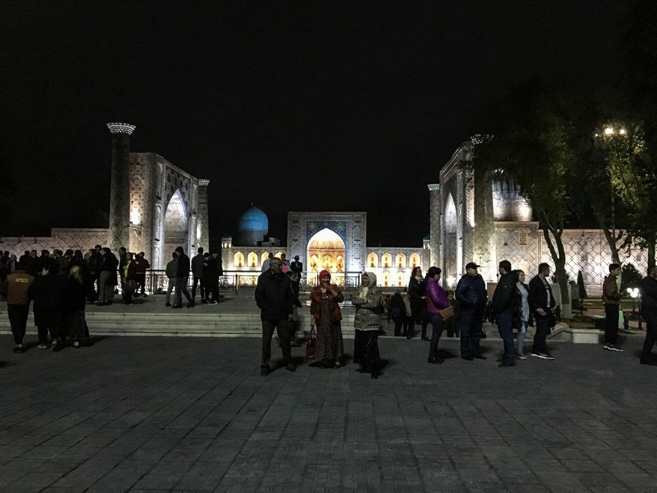 Когда стемнело, мы вернулись на главную площадь Самарканда, чтобы увидеть её в вечерней подсветке. Дождь все шёл, отчего намокшие стены комплекса загадочно сверкали и переливались в лучах подсветки.