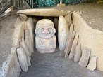 Здесь мы видим два храма-дольмена, на входе в которые установлены две скульптуры. Эти скульптуры раскрашены, что подчеркивает их особенную важность. Фигура справа мужская.
