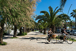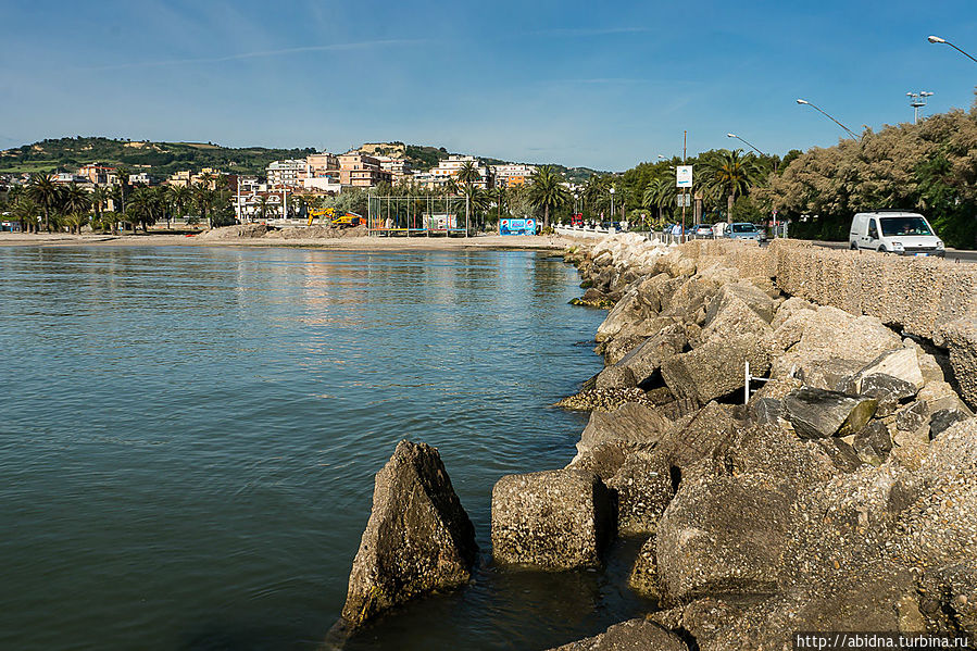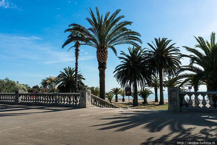 Пальмовая Ривьера Марке, что на юге области, включает такие курортные городки, как Сан Бенедетто дель Тронто, Гроттаммаре и Купармариттима. Сан Бенедетто — основной курорт, это уникальное место, где растет более 7000 пальм, и вопроса, почему Ривьера называется именно Пальмовой, тут не возникает. Набережная города, усаженная пальмами, длиной 7 км, полностью предназначена для отдыха и спортивных занятий. Помимо широченной пляжной полосы, здесь есть кафе, садики и парки, детские площадки, велосипедная дорожка и много всего другого. Мы были здесь в самом начале сезона, в конце мая, когда еще, мягко говоря, немноголюдны и пляжи и улицы. Могу только представить, что здесь творится в сезон!