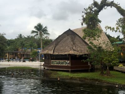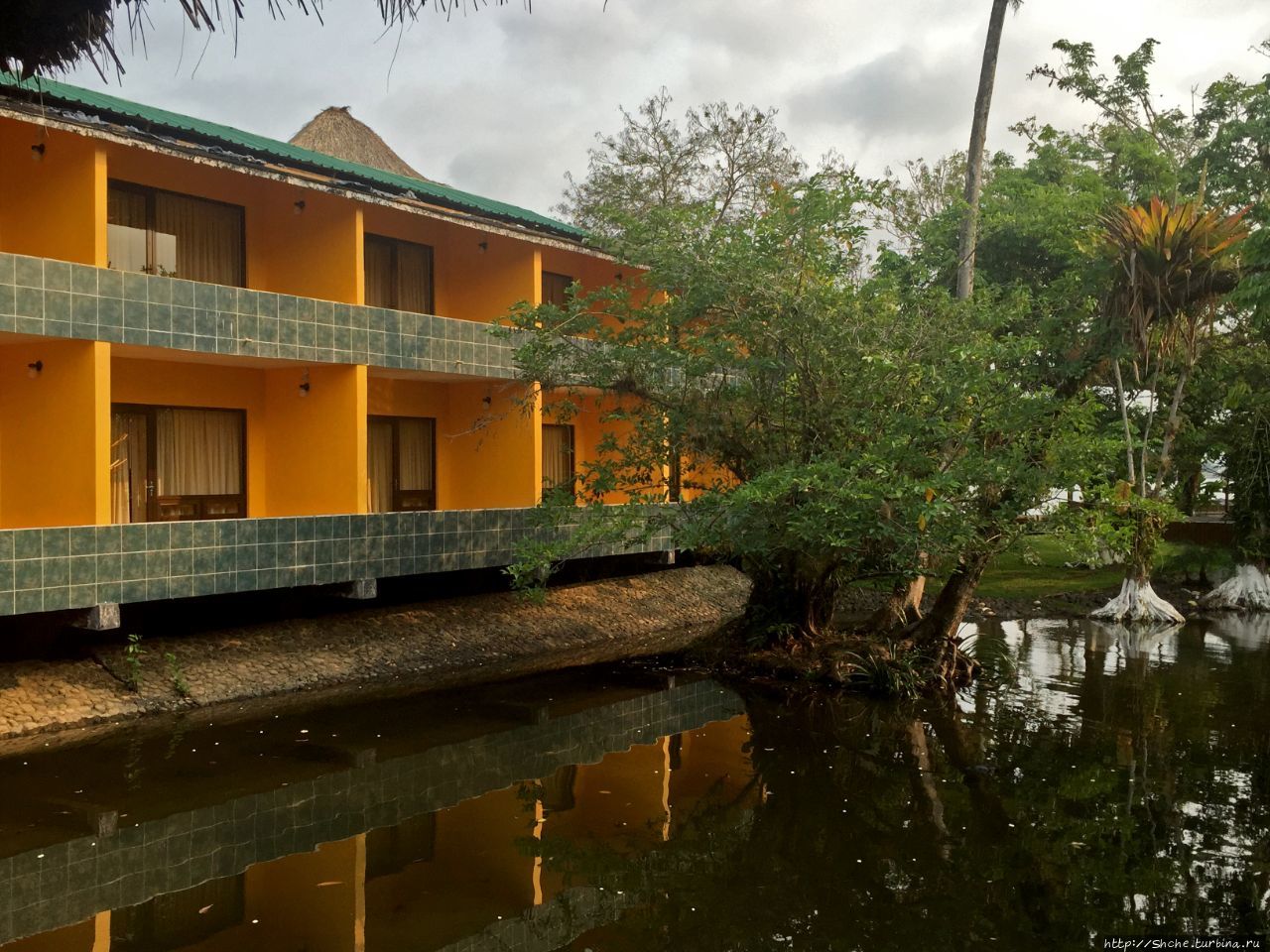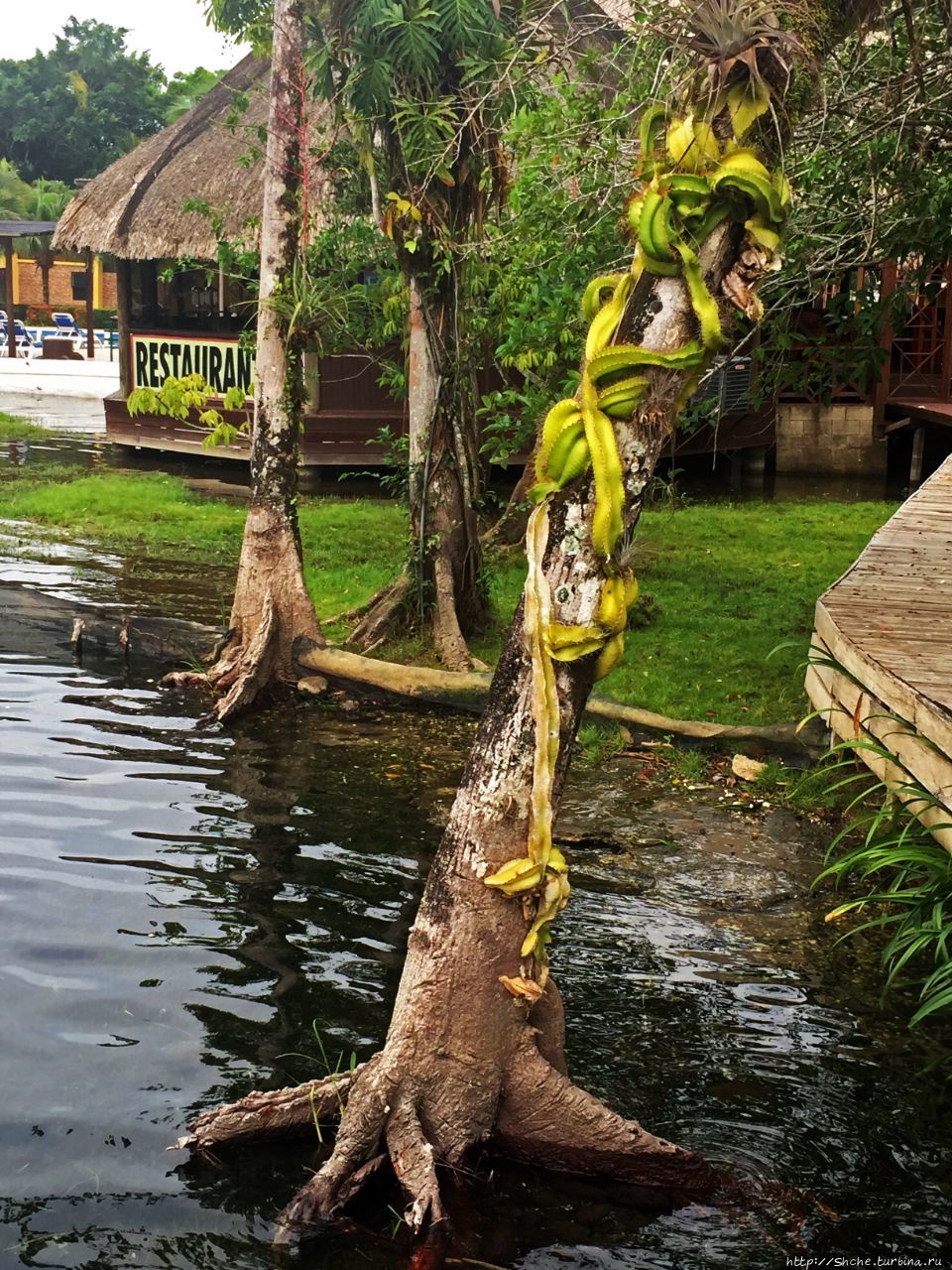 Наш гостиничный комплекс расположен на берегу реки Río Dulce, а это очень популярное место для отдыха в провинции Изабаль, и одним из самых популярных активити здесь является прогулка по реке, название которой переводится, как "Сладкая". Вот на участников речных прогулок и рассчитана эта надпись, чтобы они могли причалить отдохнуть/пообедать здесь...