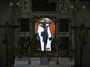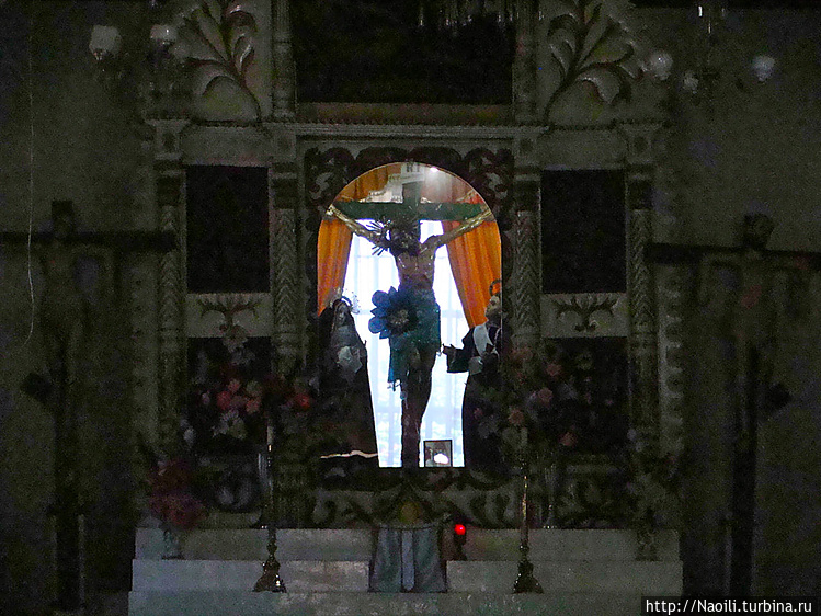 В этом храме Голгофы — центральная фигура алтаря — распятие. Вероятно сюда приходят люди, которым нужно поделится с богом своим страданием и найти силы превозмочь невзгоды. Мне удалось немного подслушать молитву, так как мы, иностранные туристы с фотоаппаратом, в Сан Кристобале являемся невидимыми персонами, которых местные жители привыкли не замечать.
