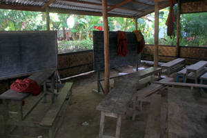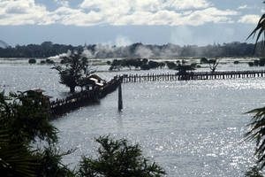 На противоположном берегу озера тянется ряд ресторанов. Но сейчас, в сезон дождей, только их соломенные крыши торчат над водой. Всего в тридцати метрах от берега находится довольно оригинальный монастырь - Шин Пин Шве Ку (Shin Pin Shwe Qu Pagoda). Его монахи, видимо, чрезвычайно увлеченные географией (а вы думали их только политика и женщины интересуют?) создали оригинальную статую Будды — с глобусом в руках. Мало того, что Будда не знал о том, что Земля круглая. Но он считал, что сам по себе интерес к устройству нашей планеты и всего мироздания — праздным. Он принципиально не хотел обсуждать не только естествознание, но и метафизические вопросы. Самое главное, с его точки зрения, не заниматься изучением этого мира, а думать только о том, как из него сбежать. Как выйти из бесконечной цепи перерождений, к которой нас привязывают страсти. В том числе, и страсть к науке о Земле. На территории этого монастыря построили высокую башню. Опять же не с практической целью, а исключительно ради удовлетворения любопытства. Только с этой башни и можно увидеть мост У-Бейн сразу, целиком.