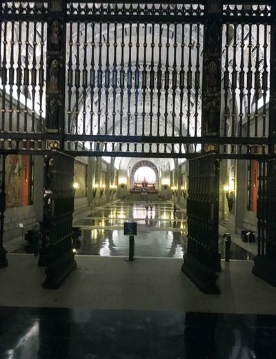 Двухсотметровый тоннель погружён в полумрак, и оттого кажется бесконечным. Своды его высоки и искусно украшены, пол сверкает, а вдоль стен расположены капеллы, расставлены скульптуры и развешаны гобелены.