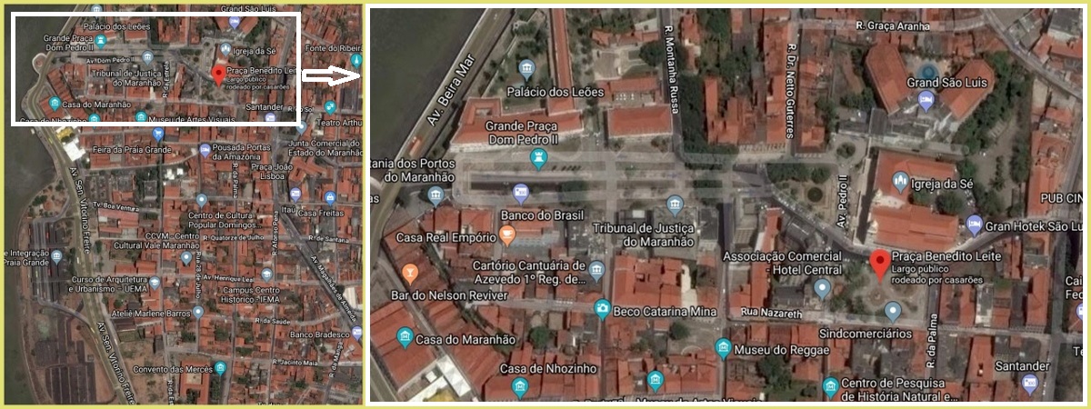 Стоит добавить, что зелёная полоса вдоль Avenida Dom Pedro II заканчивается не здесь, а чуть дальше: в тылу у кафедральной церкви тоже есть небольшой скверик. Но мы оставляем отметку координат этого материала и расстанемся на площади имени Benedito Leite, где в самой середине установлен памятник этому известному персонажу истории Мараньяна, губернатору штата в 1906-1908 годах.